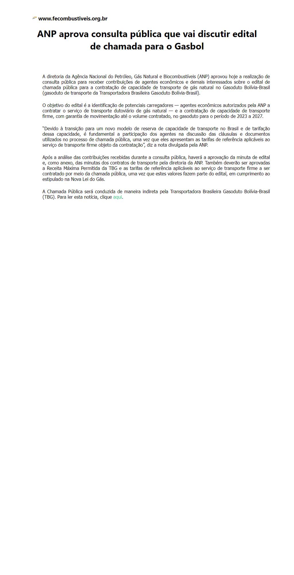 ANP aprova consulta pública que vai discutir edital de chamada para o Gasbol