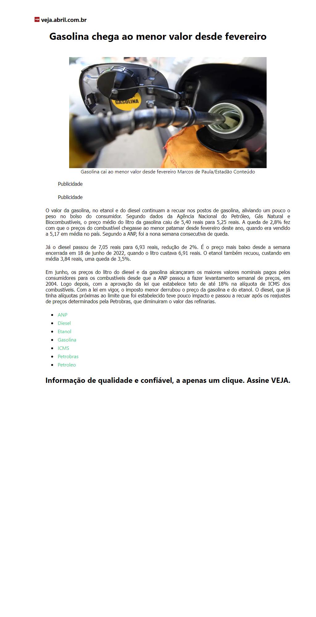 Gasolina chega ao menor valor desde fevereiro