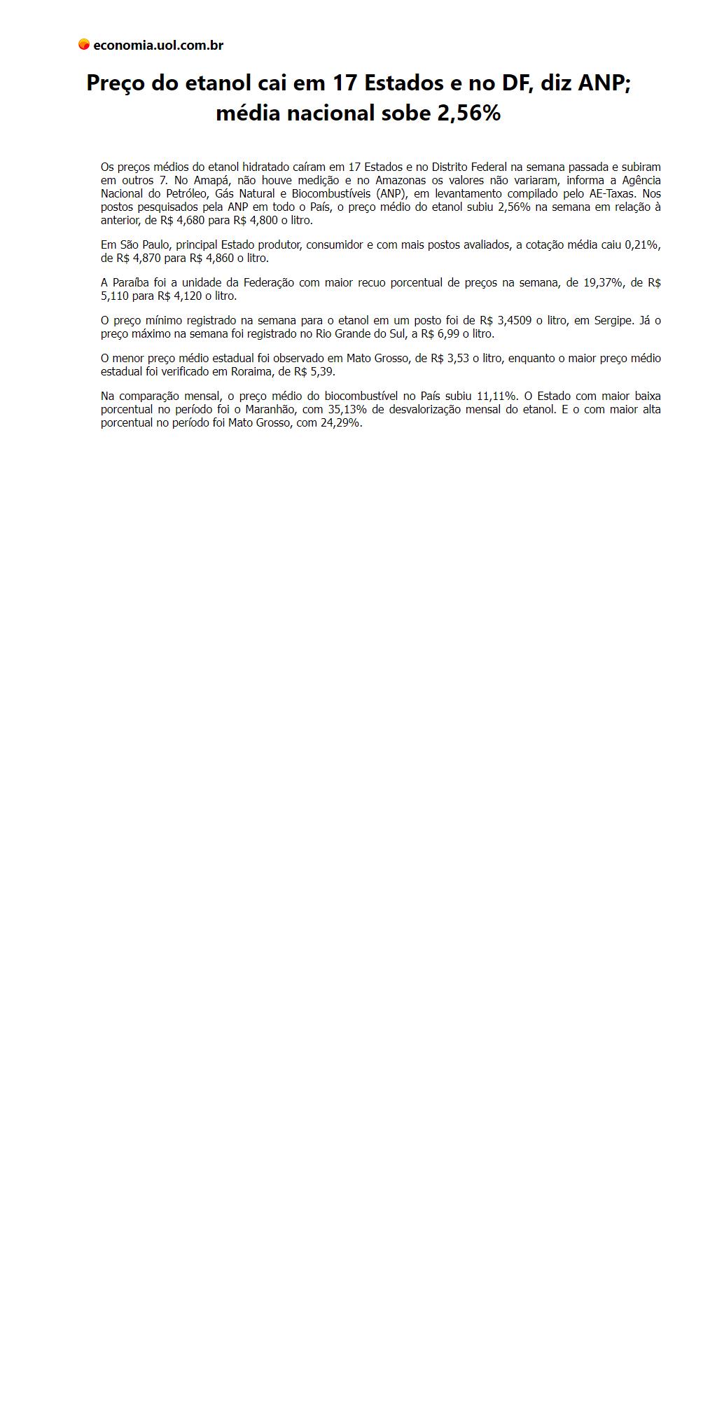 Preço do etanol cai em 17 Estados e no DF, diz ANP; média nacional sobe 2,56%