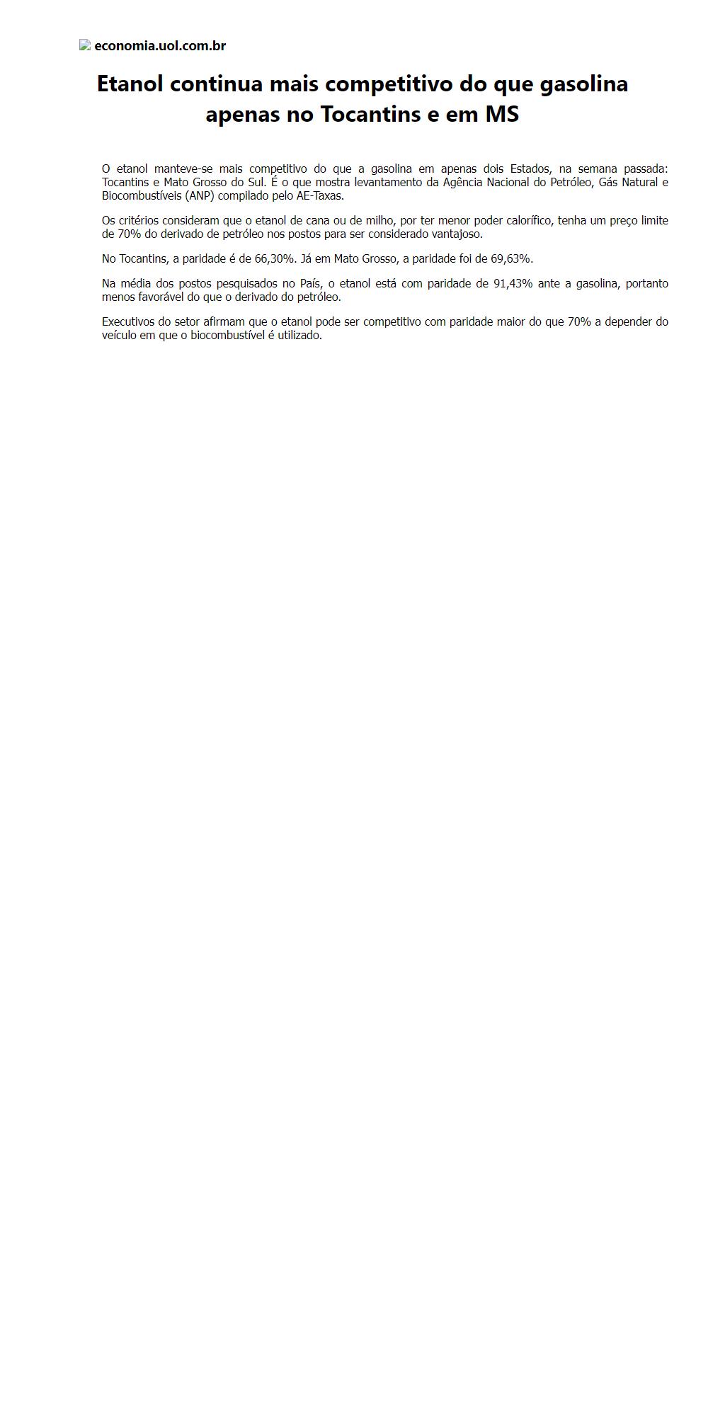 Etanol continua mais competitivo do que gasolina apenas no Tocantins e em MS