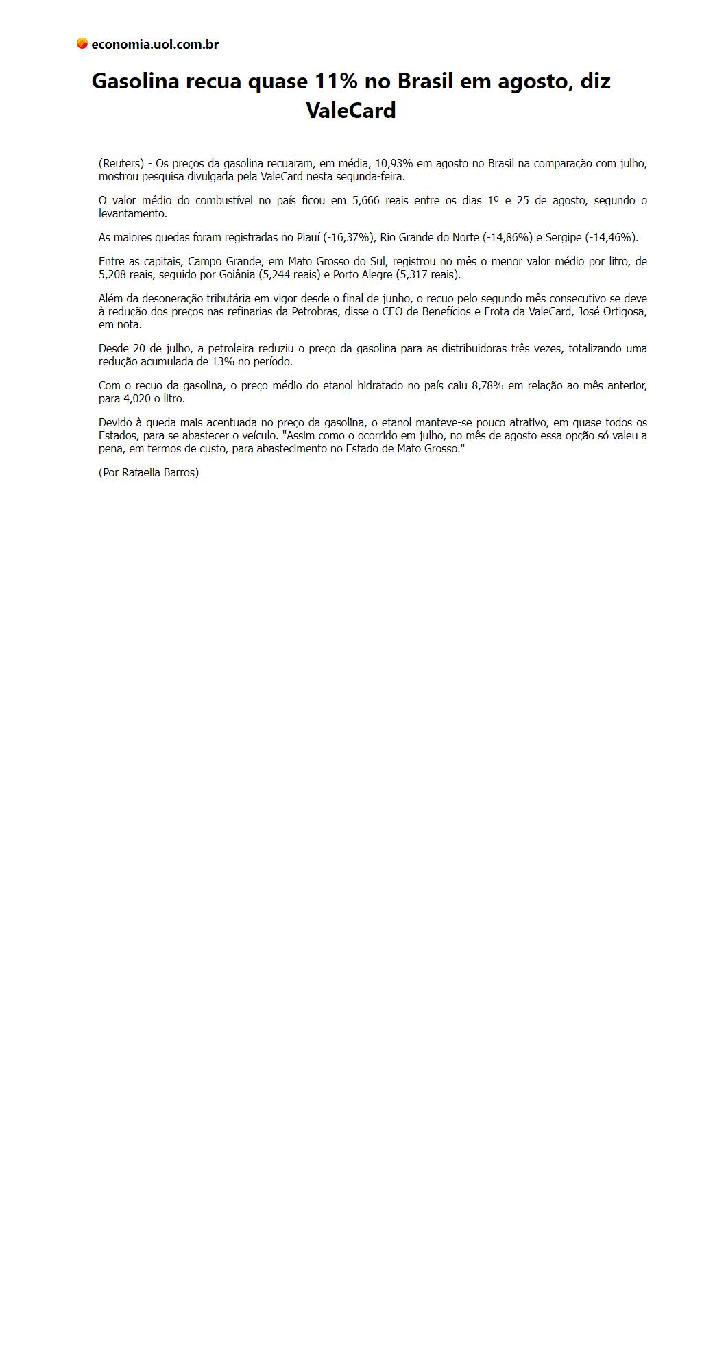 Gasolina recua quase 11% no Brasil em agosto, diz ValeCard