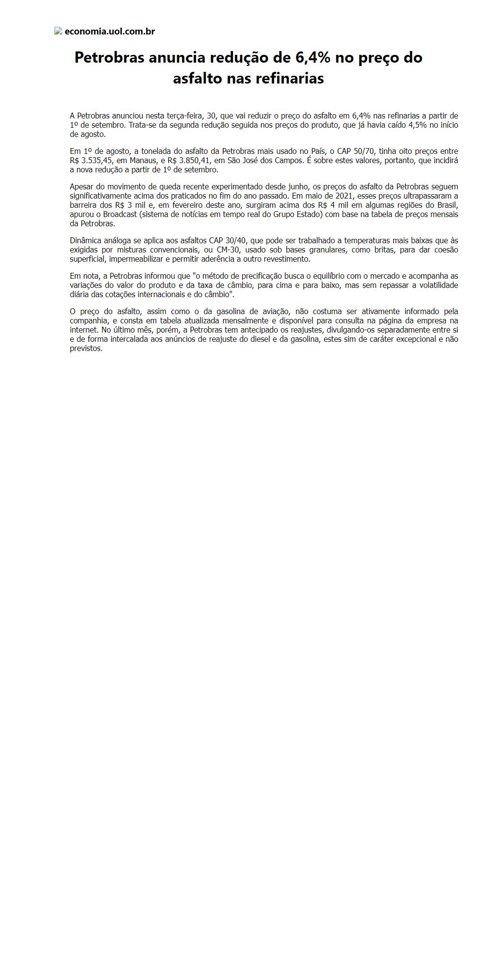 Petrobras anuncia redução de 6,4% no preço do asfalto nas refinarias