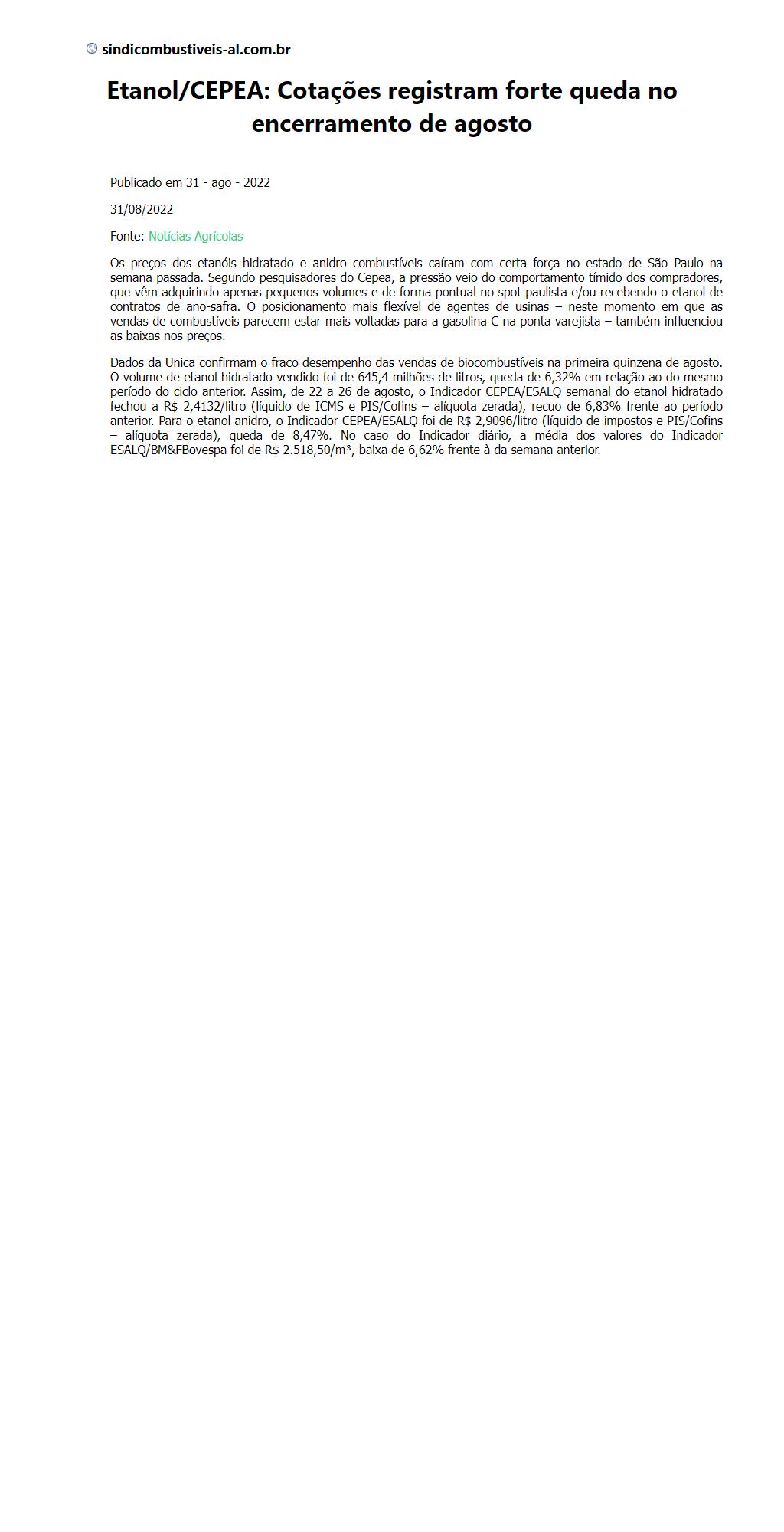 Etanol/CEPEA: Cotações registram forte queda no encerramento de agosto