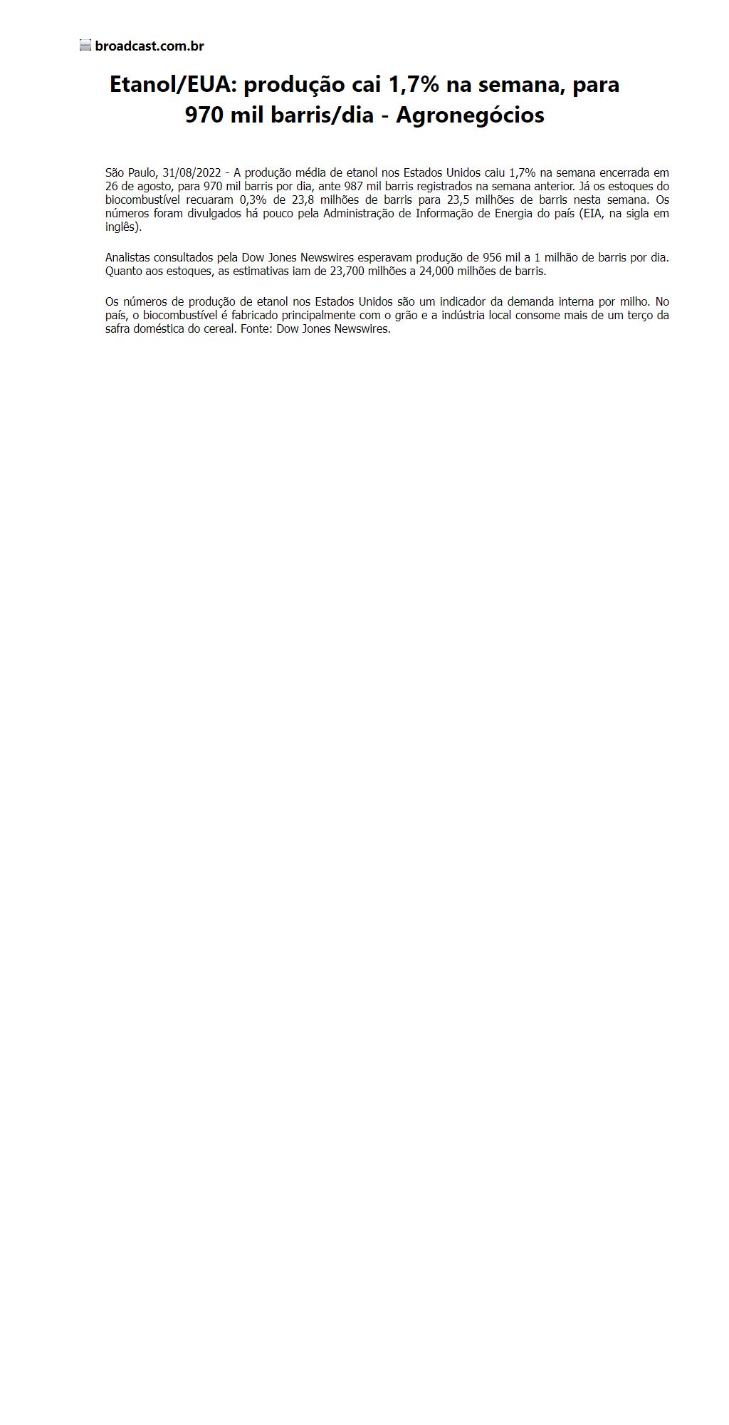Etanol/EUA: produção cai 1,7% na semana, para 970 mil barris/dia - Agronegócios