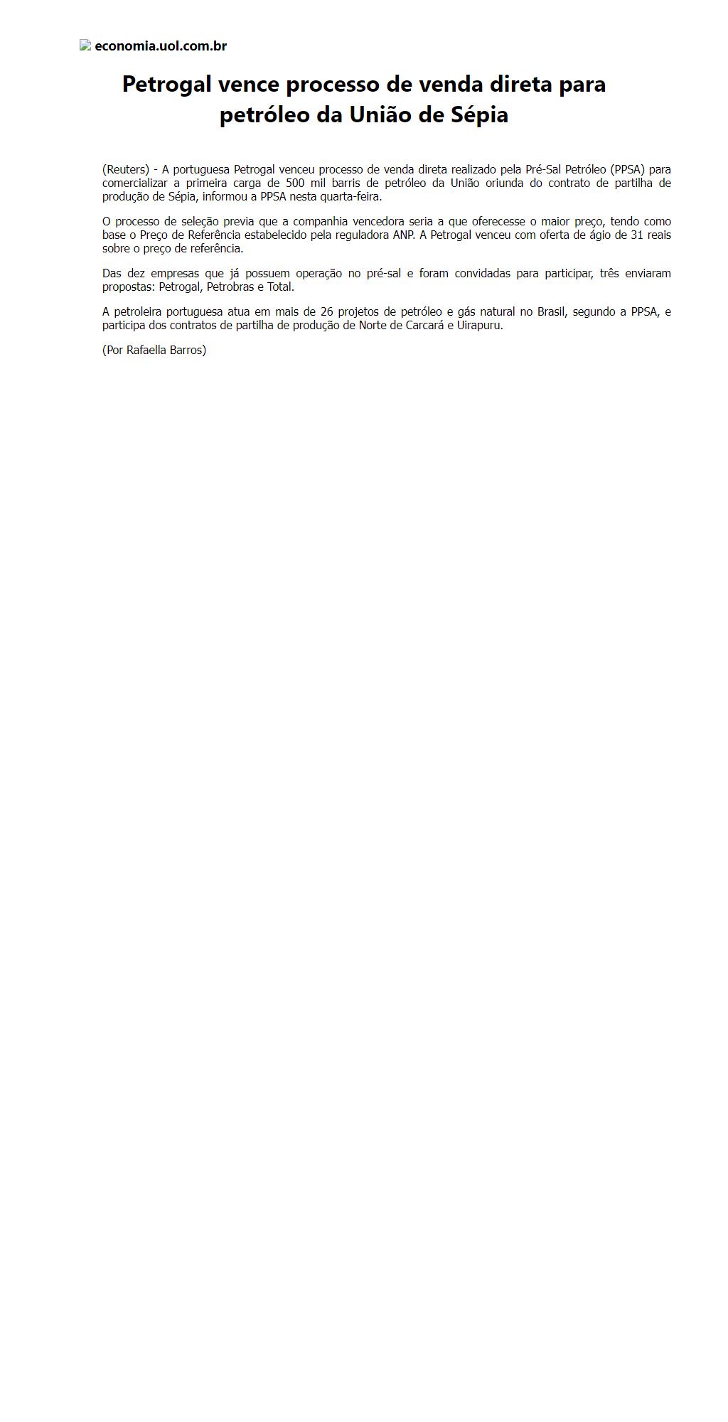 Petrogal vence processo de venda direta para petróleo da União de Sépia