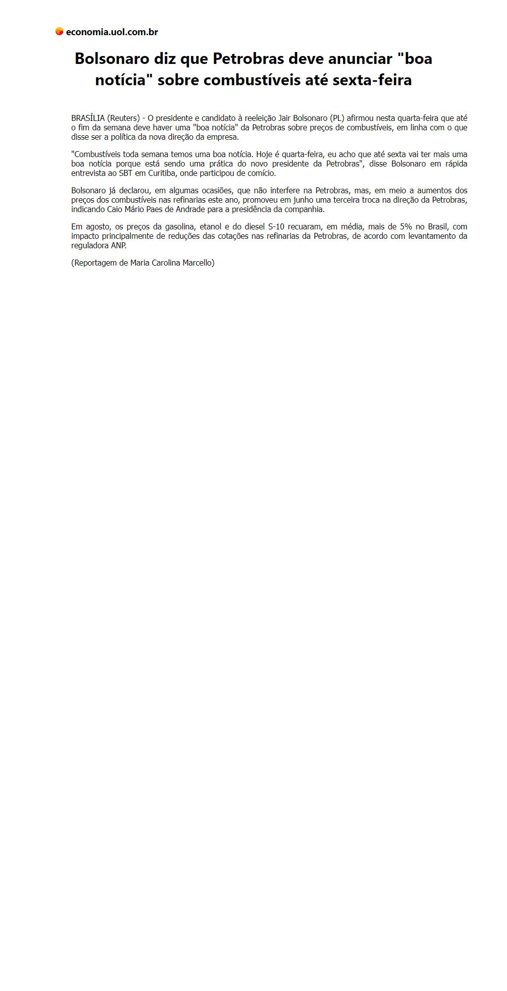 Bolsonaro diz que Petrobras deve anunciar "boa notícia" sobre combustíveis até sexta-feira