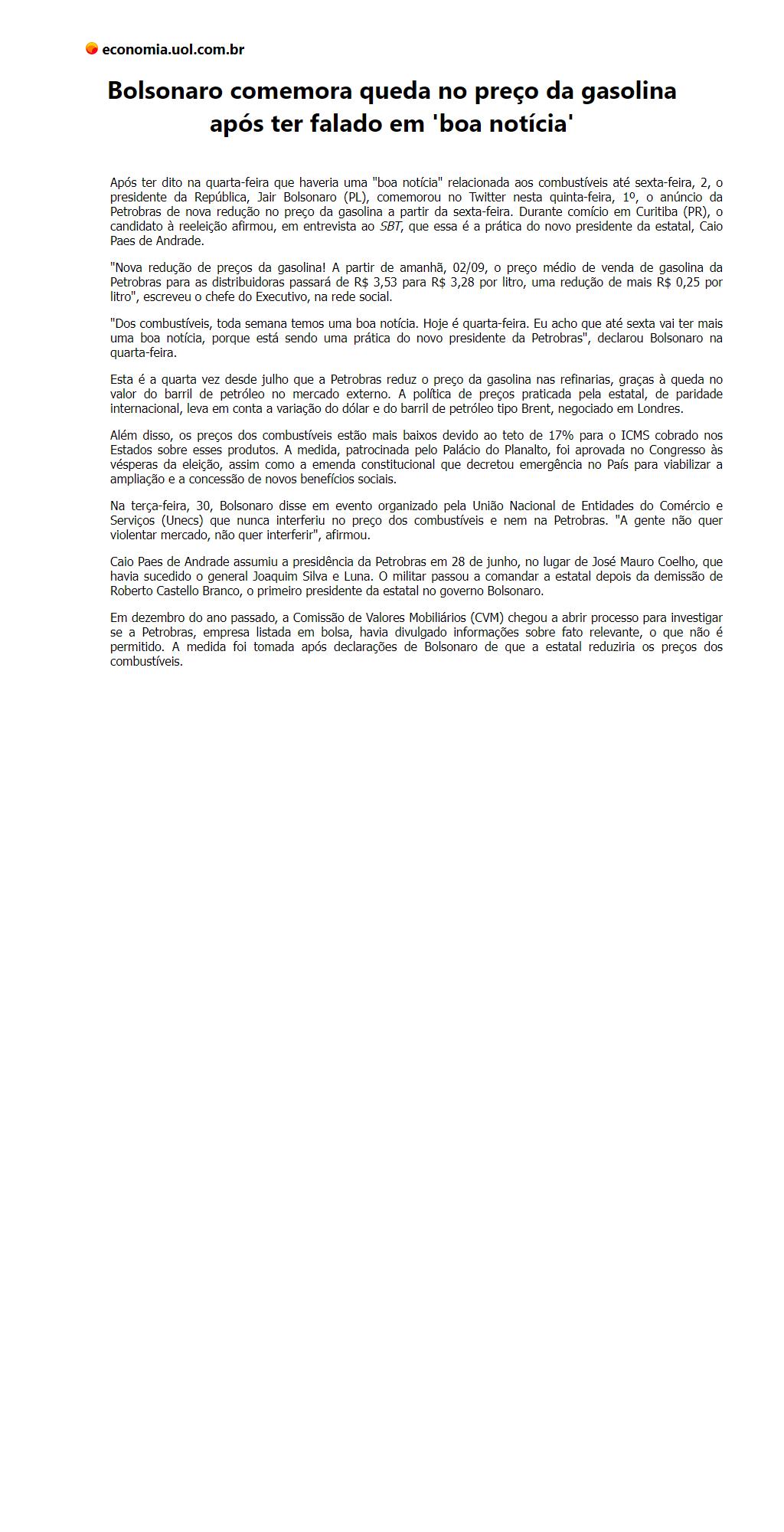 Bolsonaro comemora queda no preço da gasolina após ter falado em 'boa notícia'
