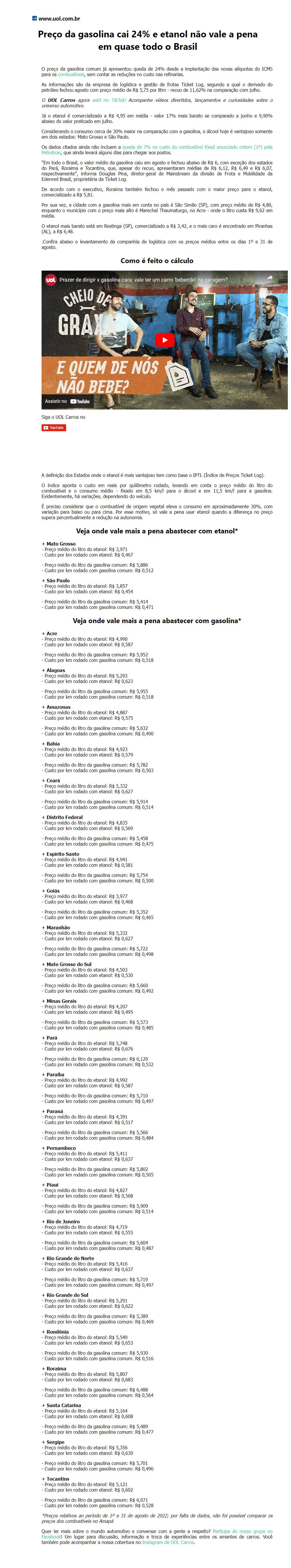 Preço da gasolina cai 24% e etanol não vale a pena em quase todo o Brasil
