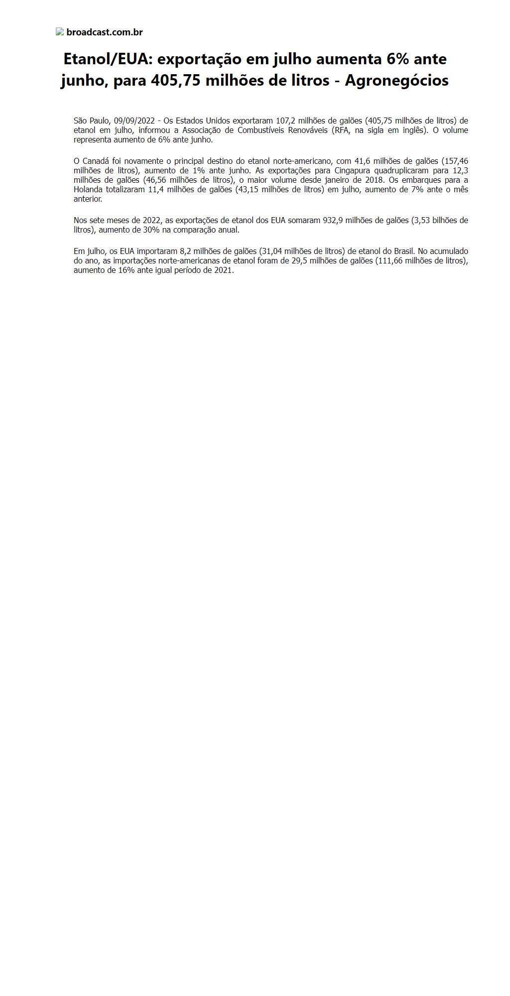 Etanol/EUA: exportação em julho aumenta 6% ante junho, para 405,75 milhões de litros - Agronegócios
