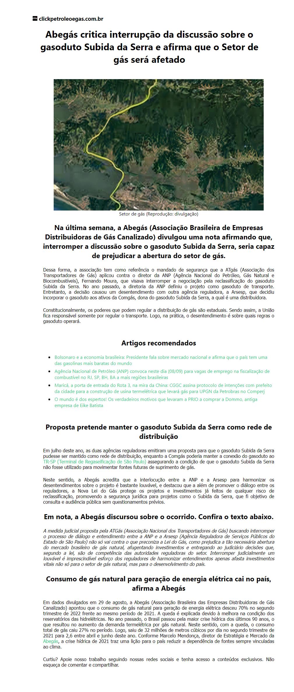 Abegás critica interrupção da discussão sobre o gasoduto Subida da Serra e afirma que o Setor de gás será afetado