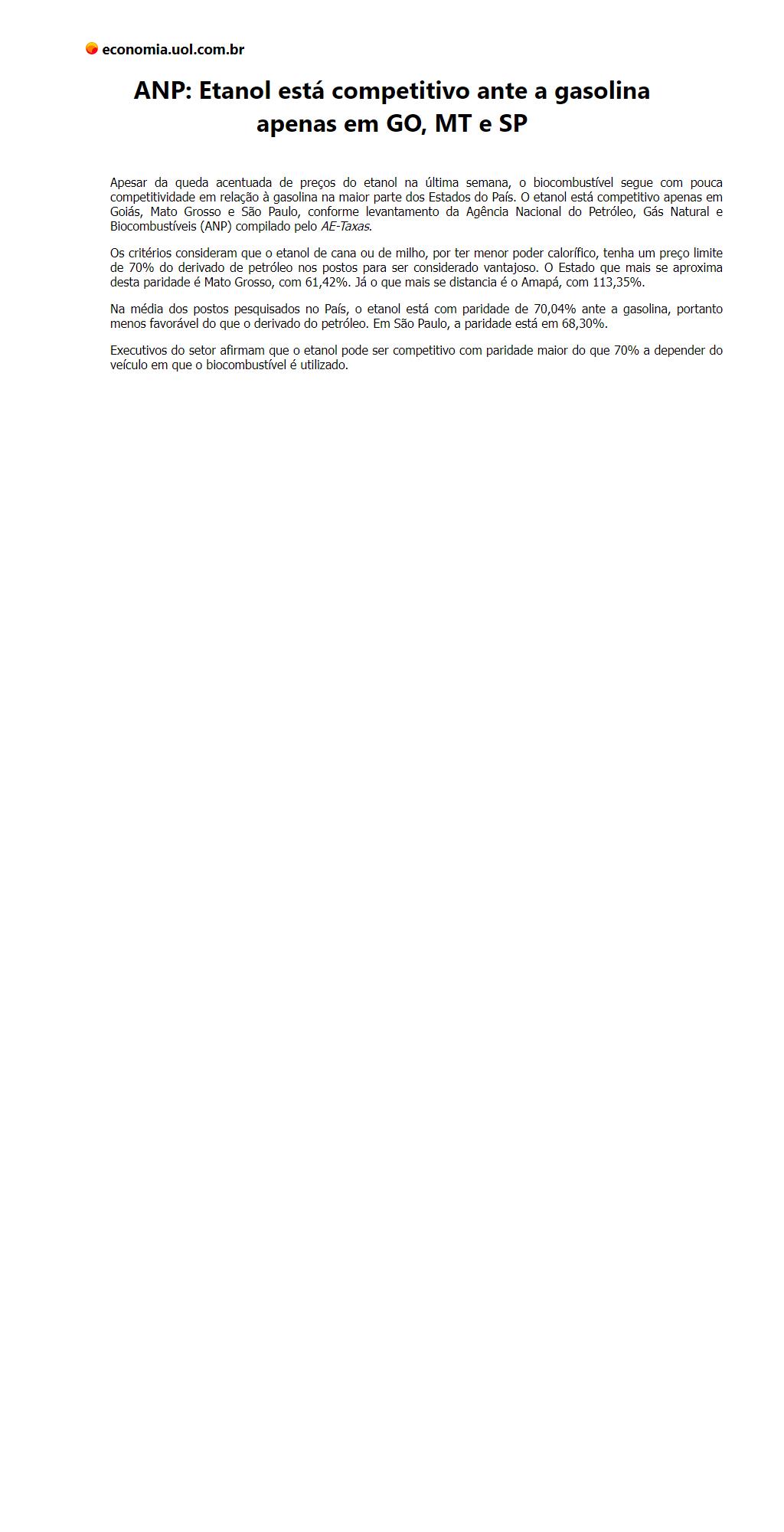 ANP: Etanol está competitivo ante a gasolina apenas em GO, MT e SP