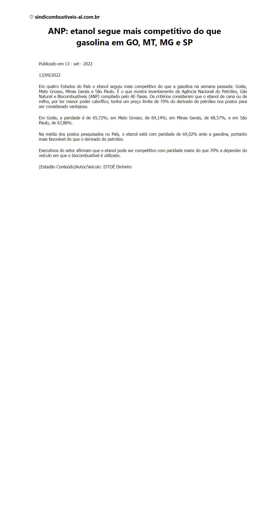 ANP: etanol segue mais competitivo do que gasolina em GO, MT, MG e SP