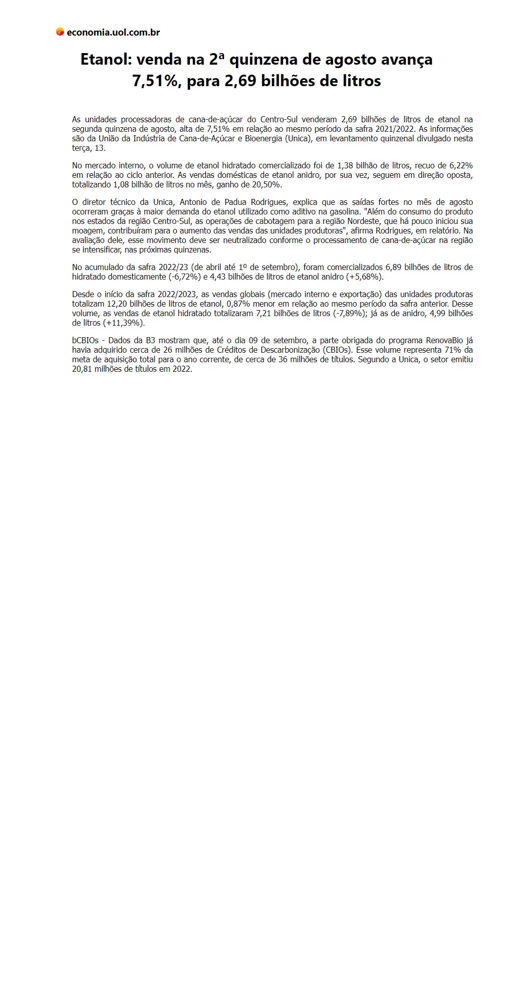 Etanol: venda na 2ª quinzena de agosto avança 7,51%, para 2,69 bilhões de litros