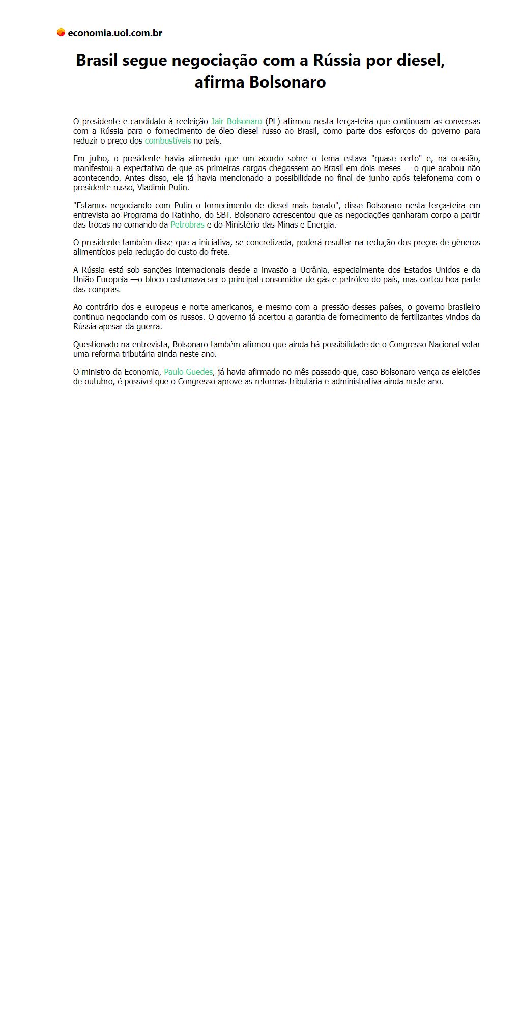 Brasil segue negociação com a Rússia por diesel, afirma Bolsonaro