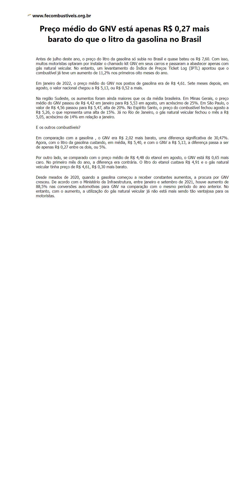 Preço médio do GNV está apenas R$ 0,27 mais barato do que o litro da gasolina no Brasil