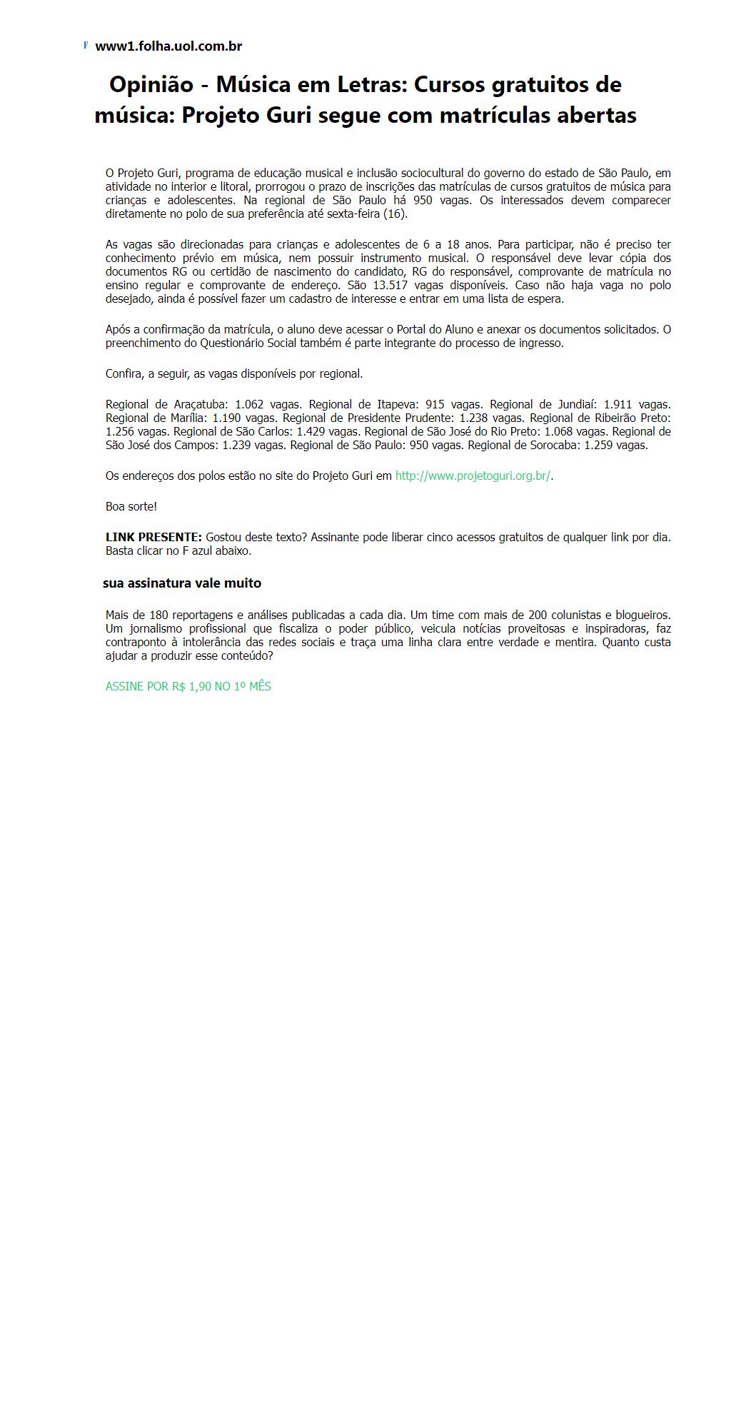 Opinião - Música em Letras: Cursos gratuitos de música: Projeto Guri segue com matrículas abertas