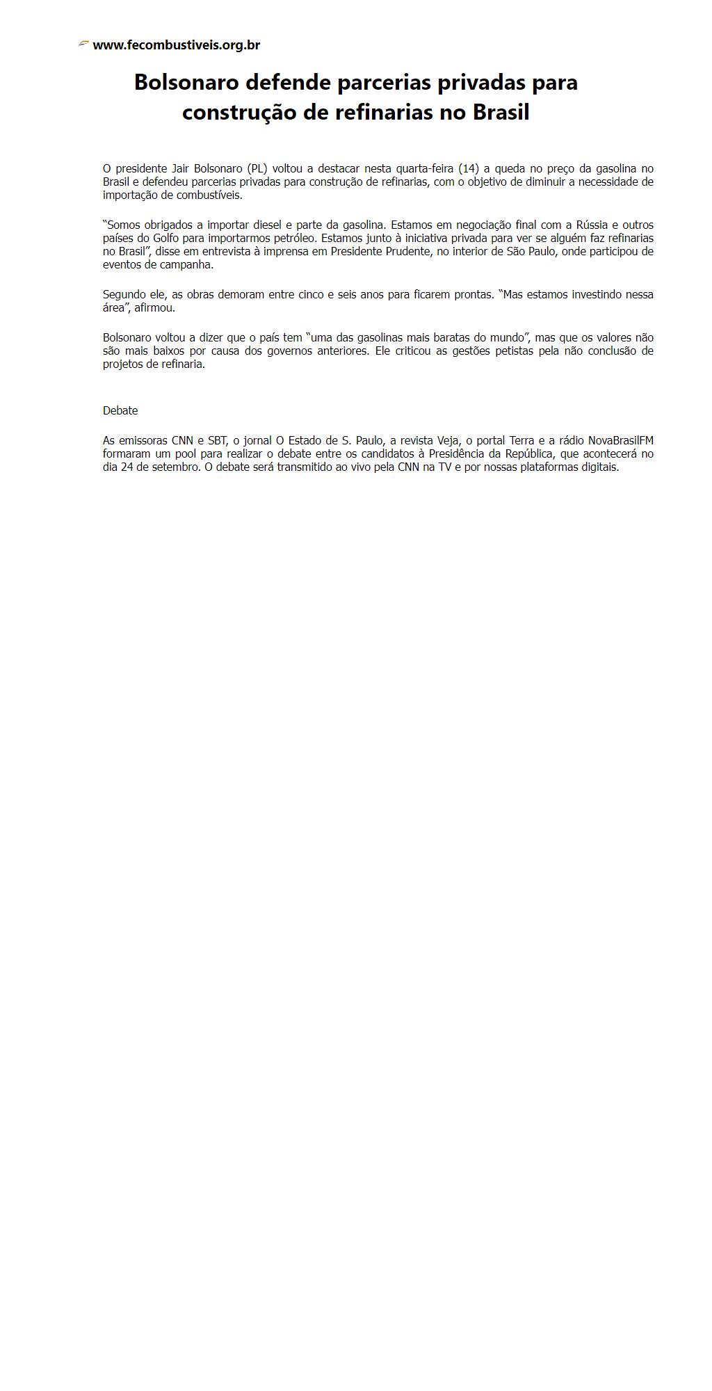 Bolsonaro defende parcerias privadas para construção de refinarias no Brasil