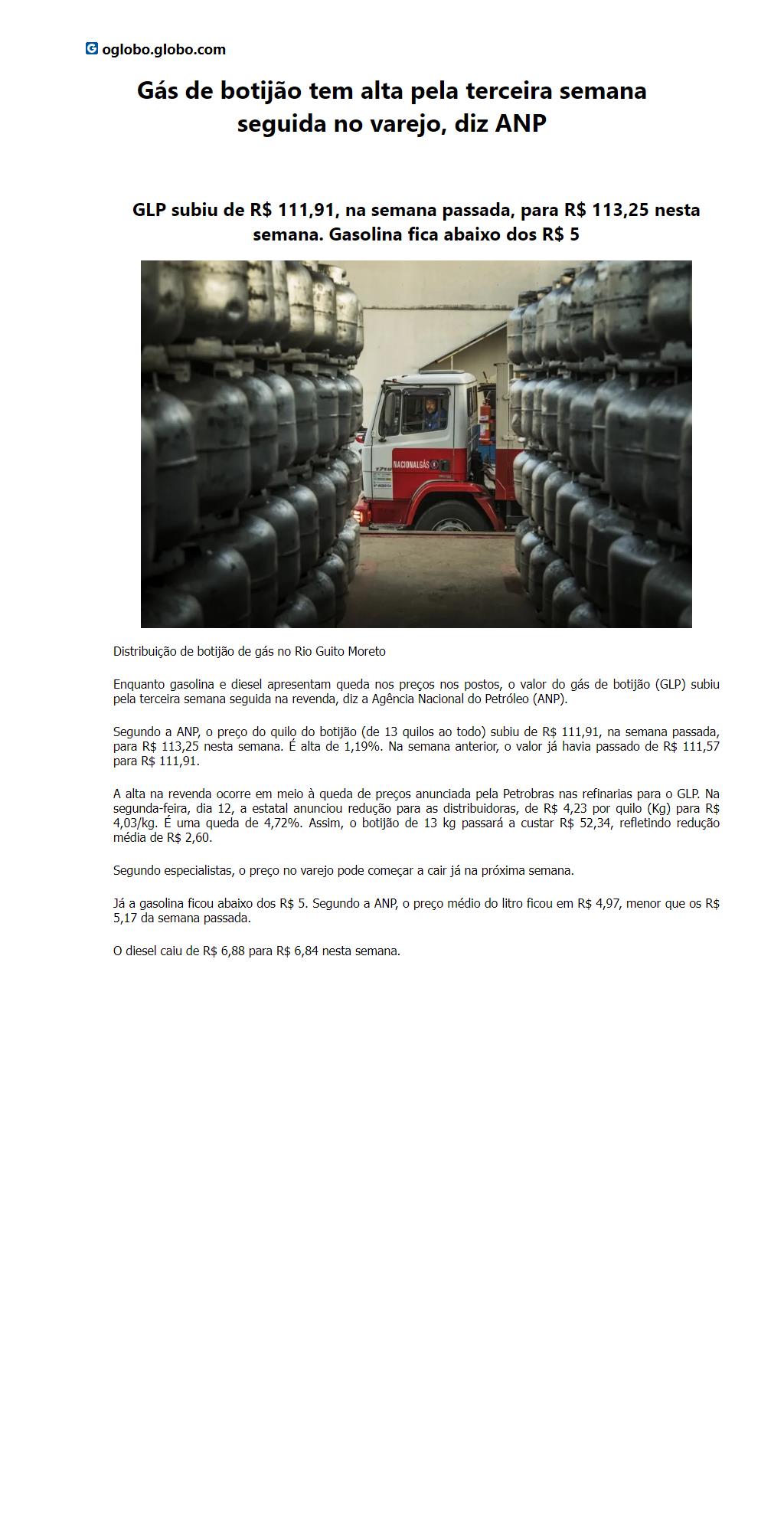 Gás de botijão tem alta pela terceira semana seguida no varejo, diz ANP