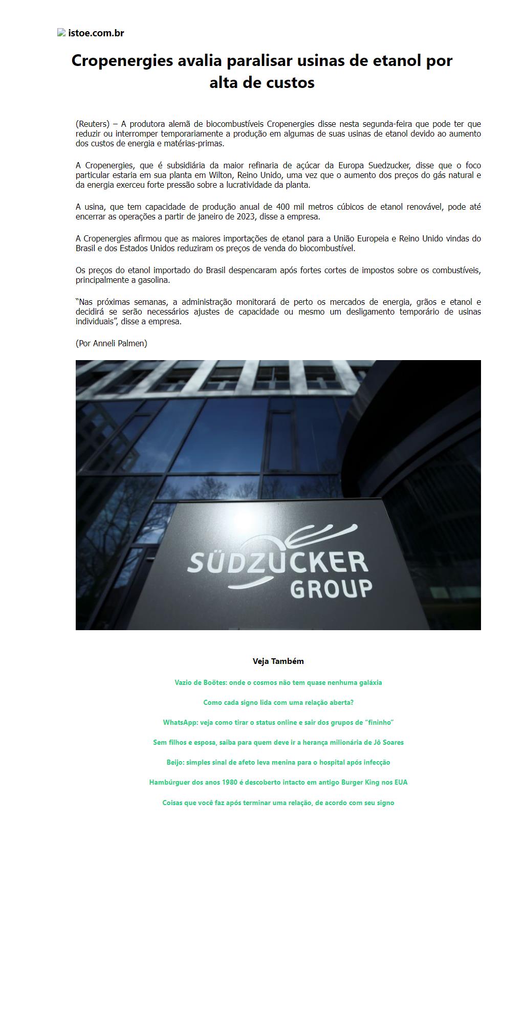 Cropenergies avalia paralisar usinas de etanol por alta de custos