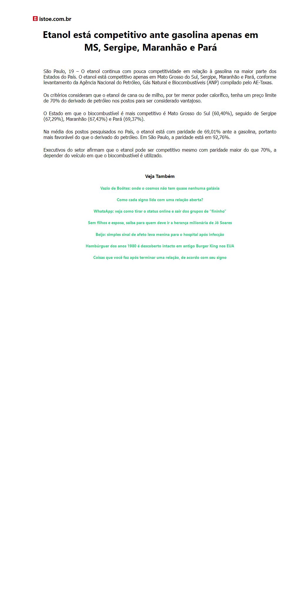Etanol está competitivo ante gasolina apenas em MS, Sergipe, Maranhão e Pará