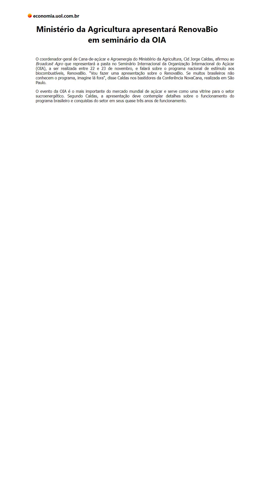 Ministério da Agricultura apresentará RenovaBio em seminário da OIA