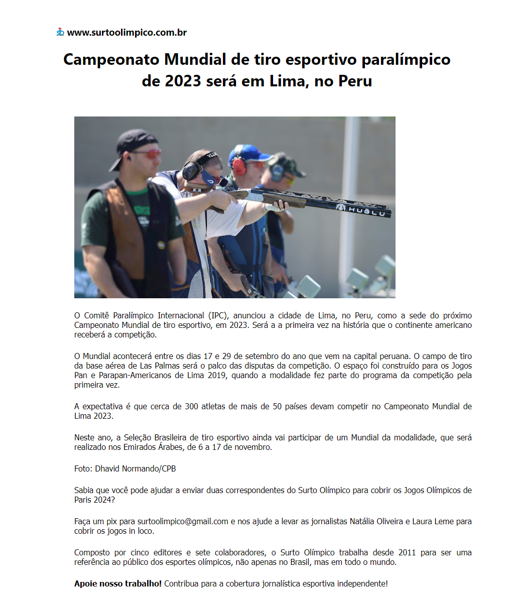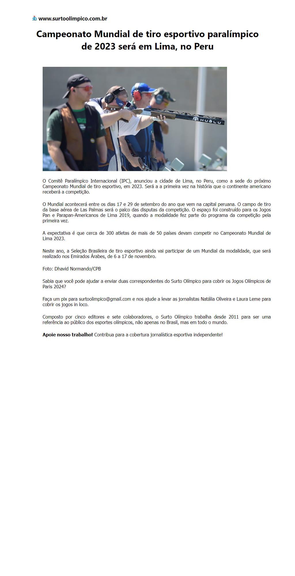 Campeonato Mundial de tiro esportivo paralímpico de 2023 será em Lima, no Peru