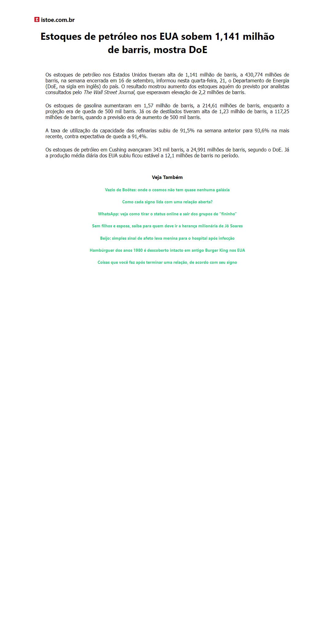 Estoques de petróleo nos EUA sobem 1,141 milhão de barris, mostra DoE