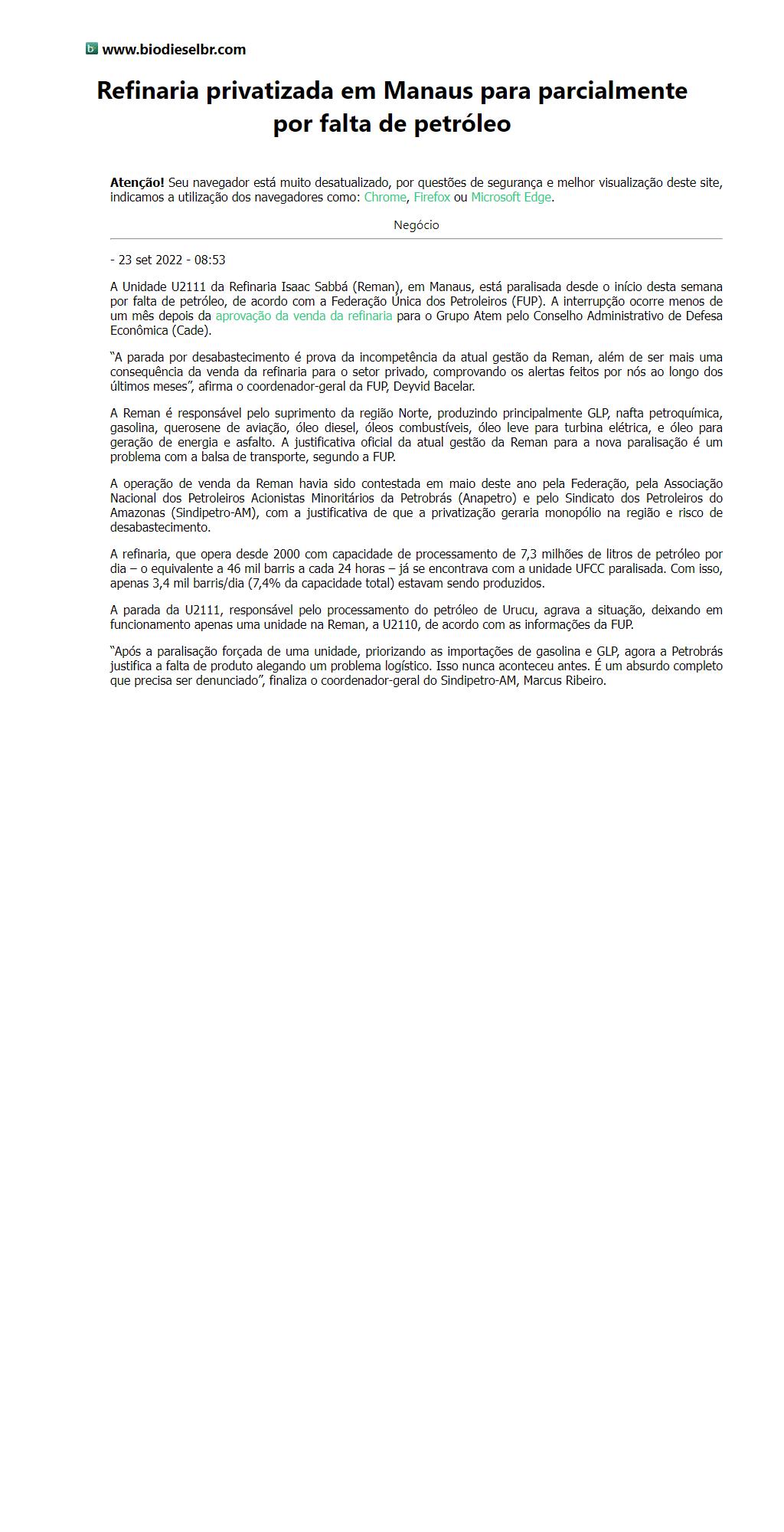 Refinaria privatizada em Manaus para parcialmente por falta de petróleo