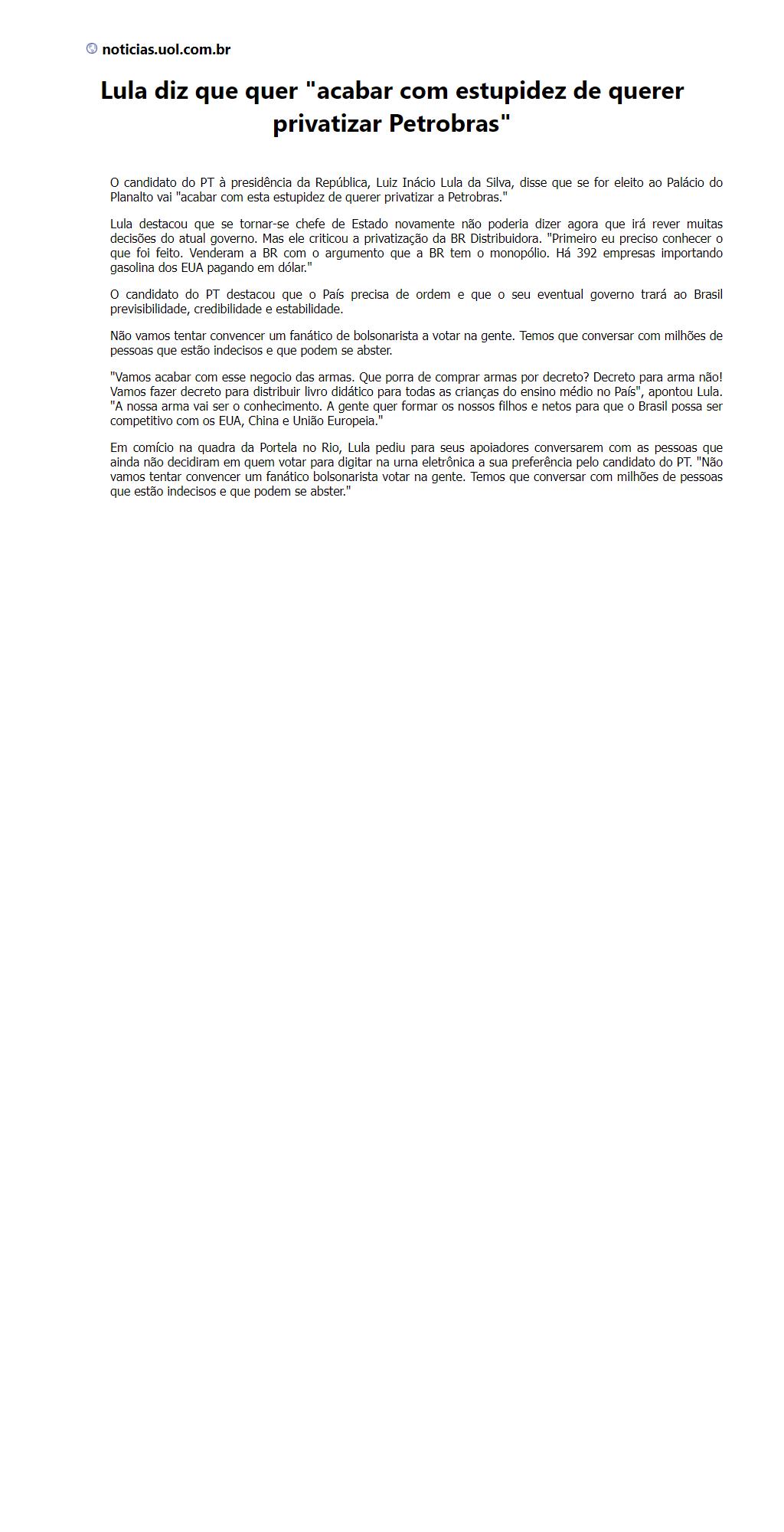 Lula diz que quer "acabar com estupidez de querer privatizar Petrobras"