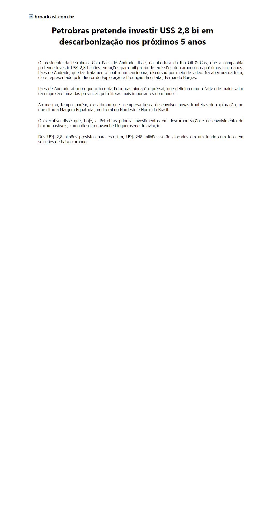 Petrobras pretende investir US$ 2,8 bi em descarbonização nos próximos 5 anos