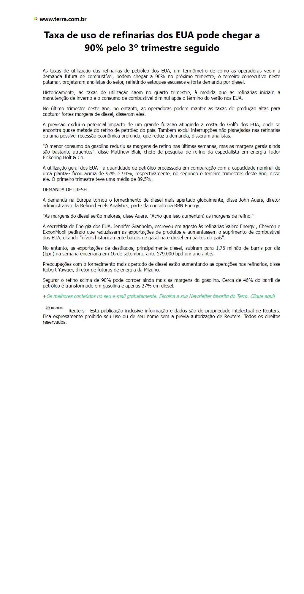 Taxa de uso de refinarias dos EUA pode chegar a 90% pelo 3º trimestre seguido