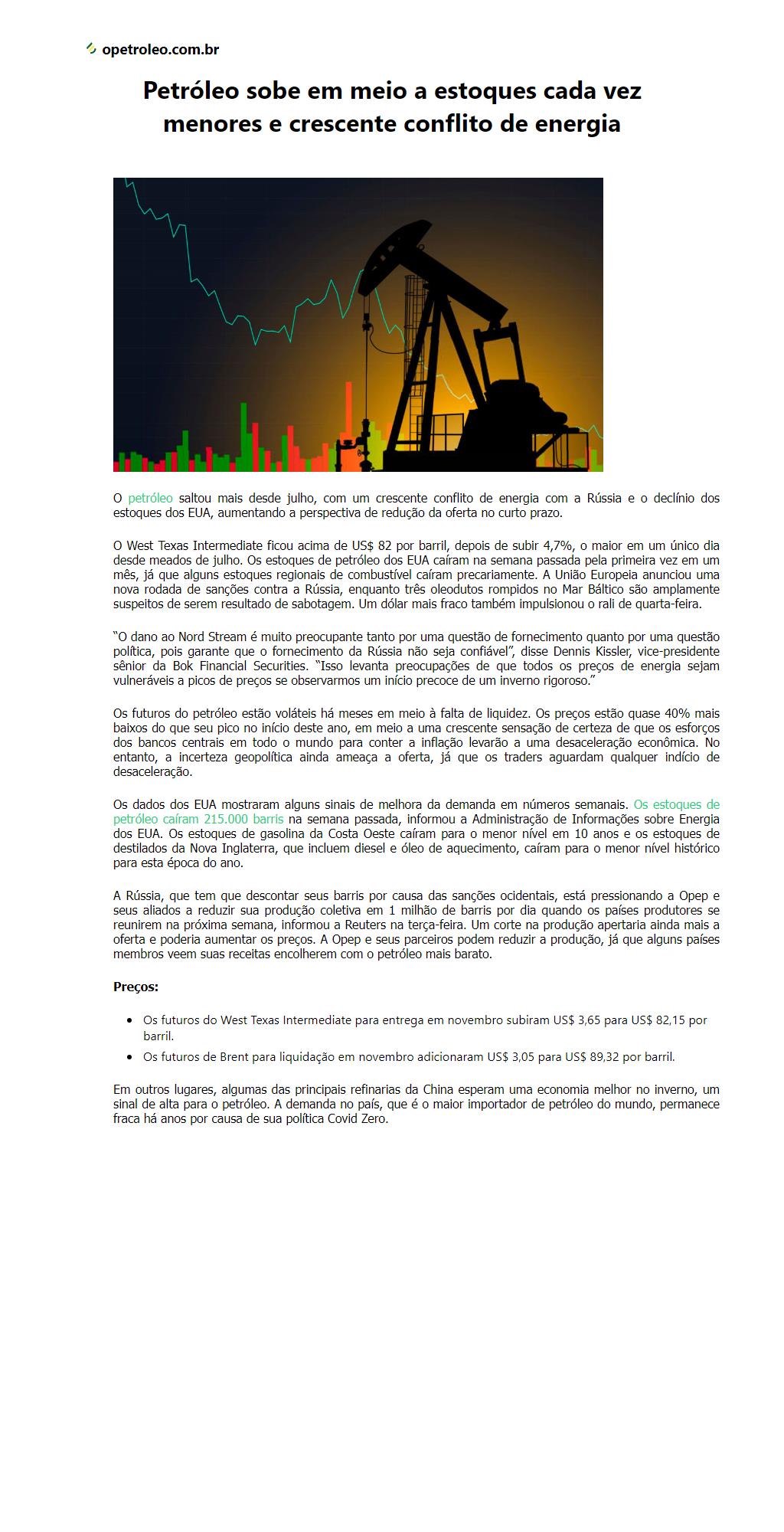 Petróleo sobe em meio a estoques cada vez menores e crescente conflito de energia