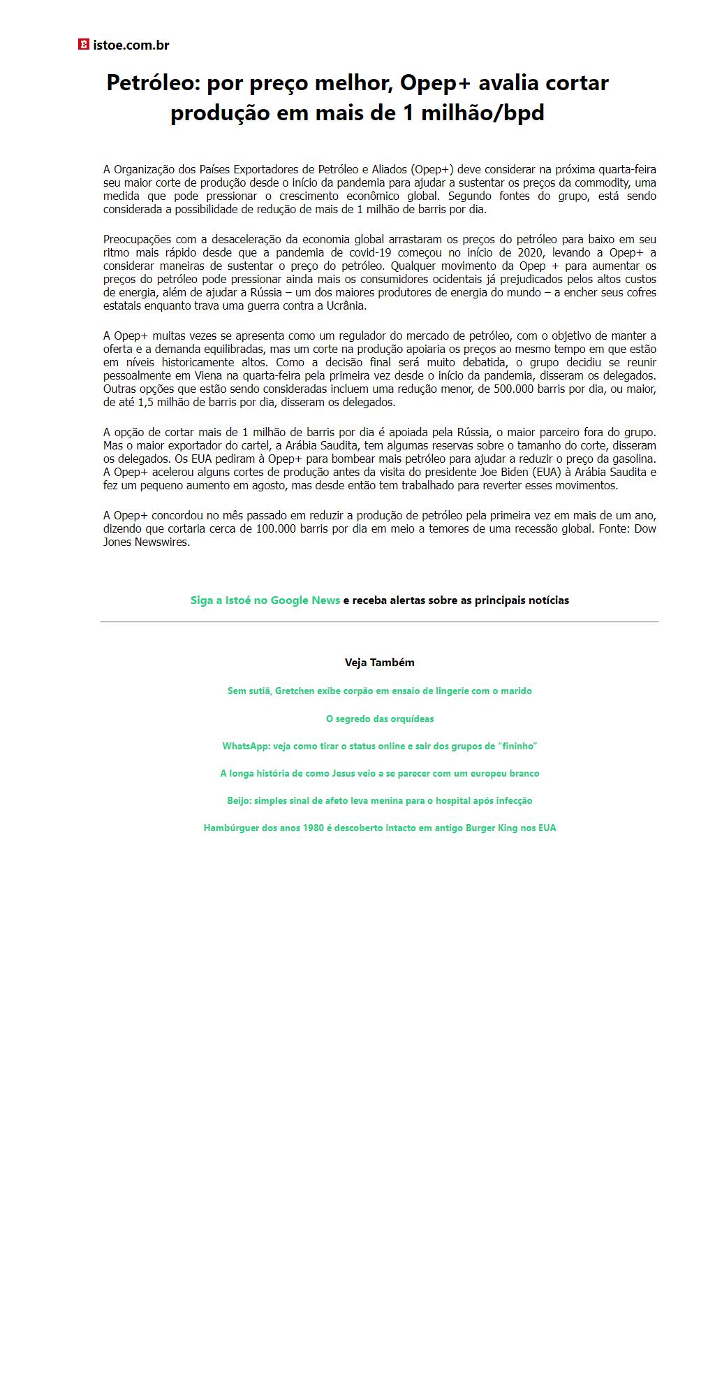 Petróleo: por preço melhor, Opep+ avalia cortar produção em mais de 1 milhão/bpd