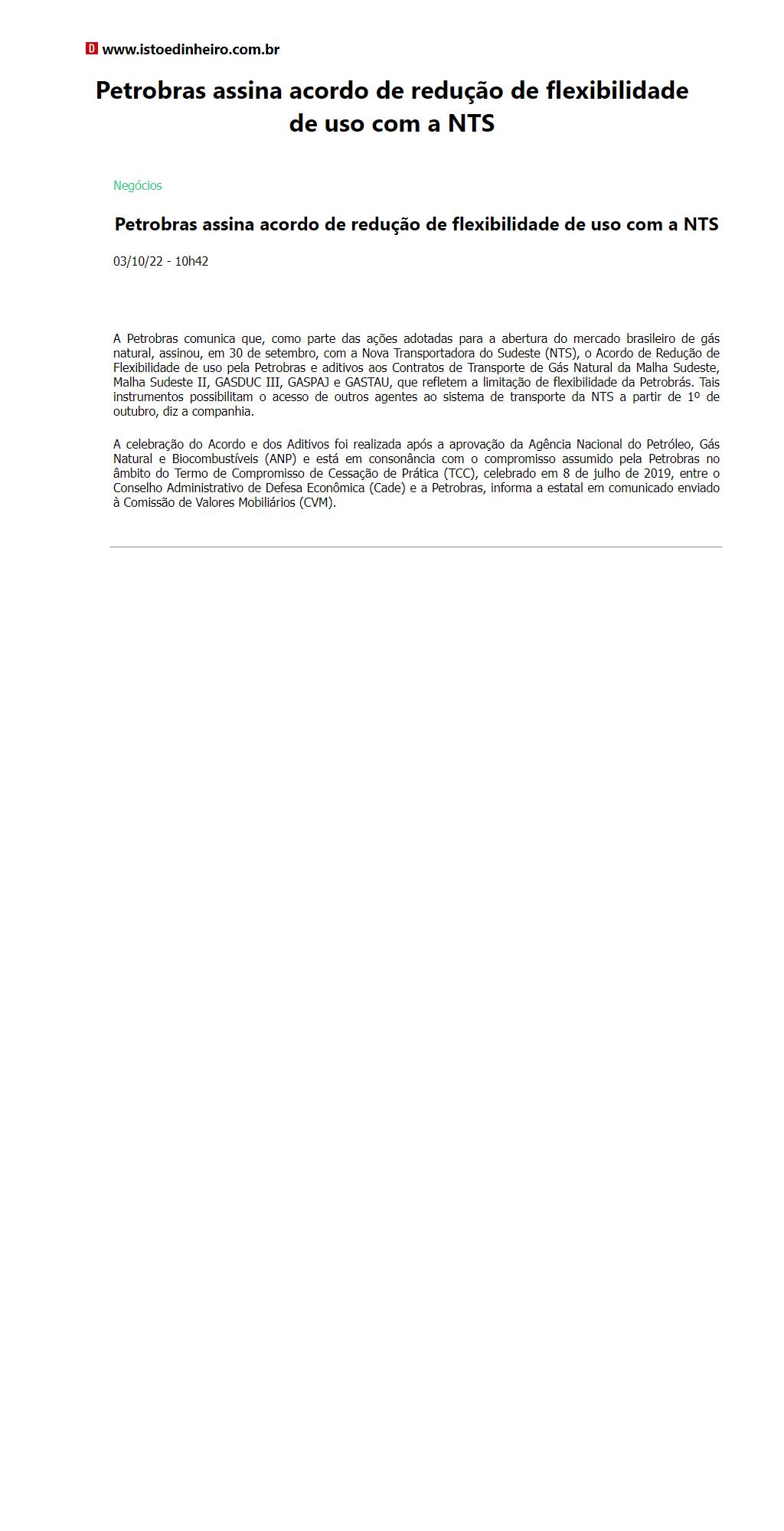 Petrobras assina acordo de redução de flexibilidade de uso com a NTS
