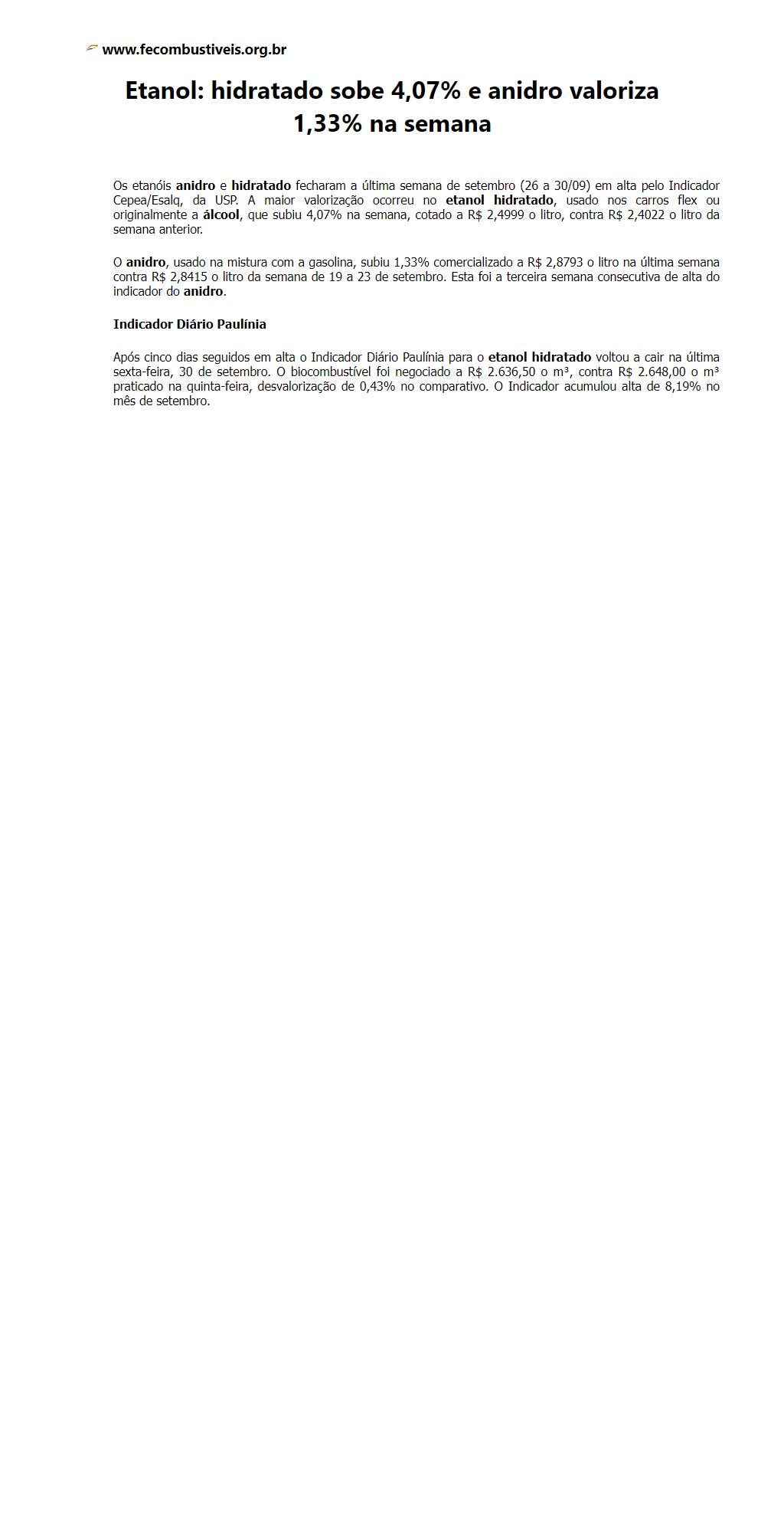 Etanol: hidratado sobe 4,07% e anidro valoriza 1,33% na semana