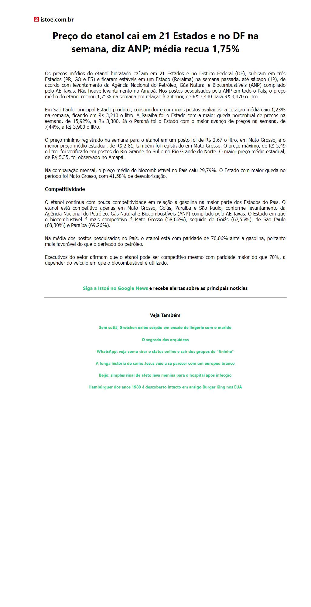 Preço do etanol cai em 21 Estados e no DF na semana, diz ANP; média recua 1,75%