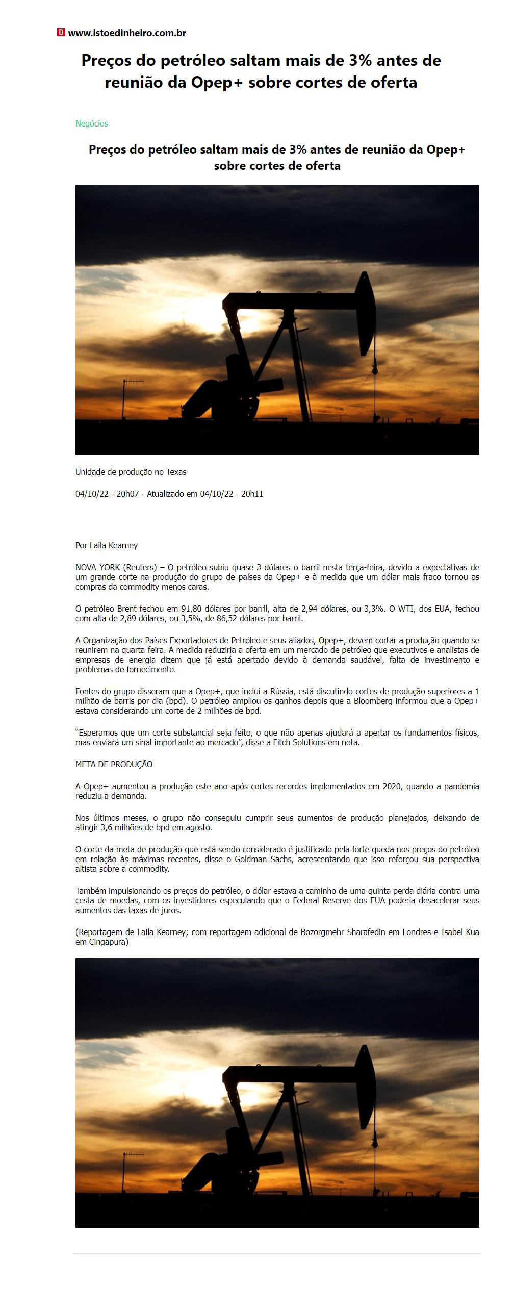 Preços do petróleo saltam mais de 3% antes de reunião da Opep+ sobre cortes de oferta