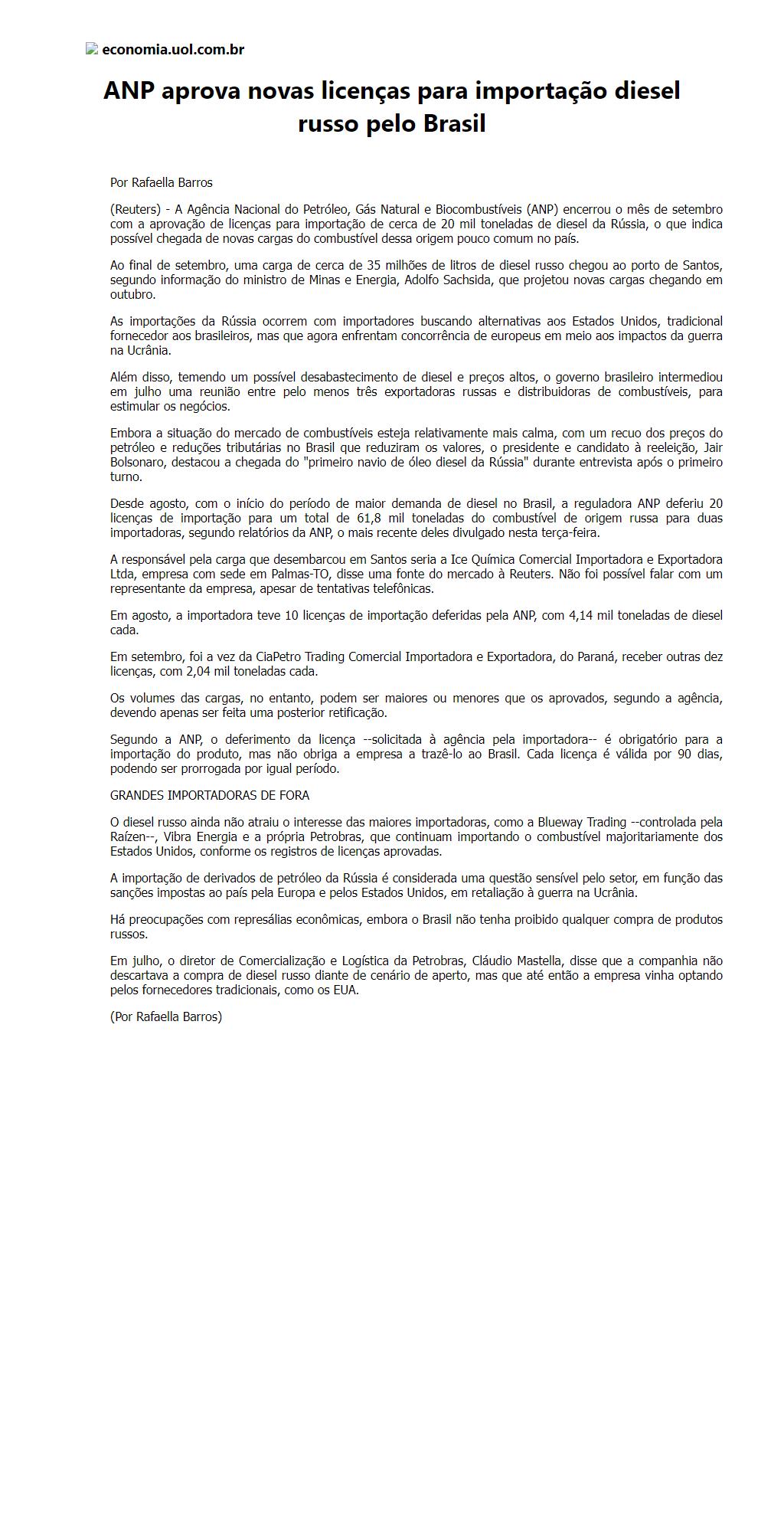 ANP aprova novas licenças para importação diesel russo pelo Brasil
