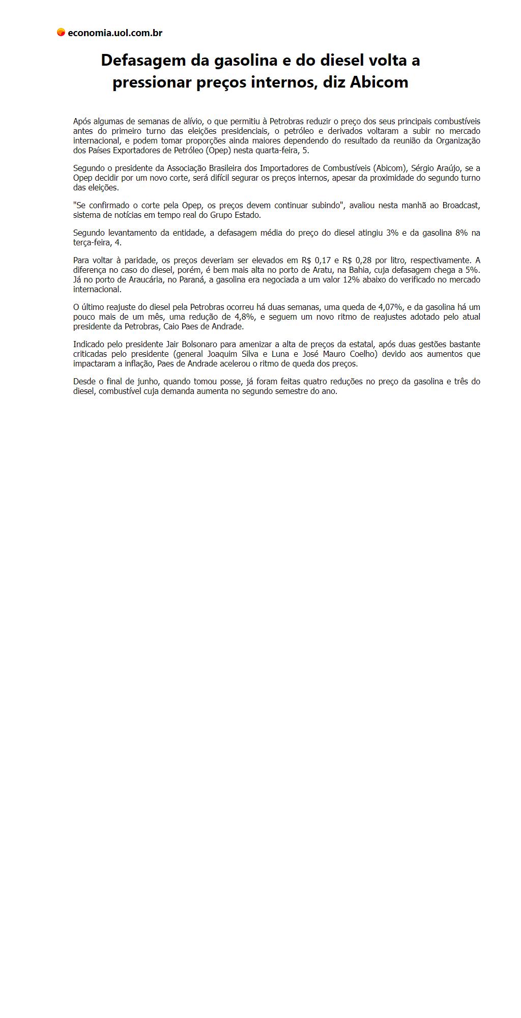 Defasagem da gasolina e do diesel volta a pressionar preços internos, diz Abicom