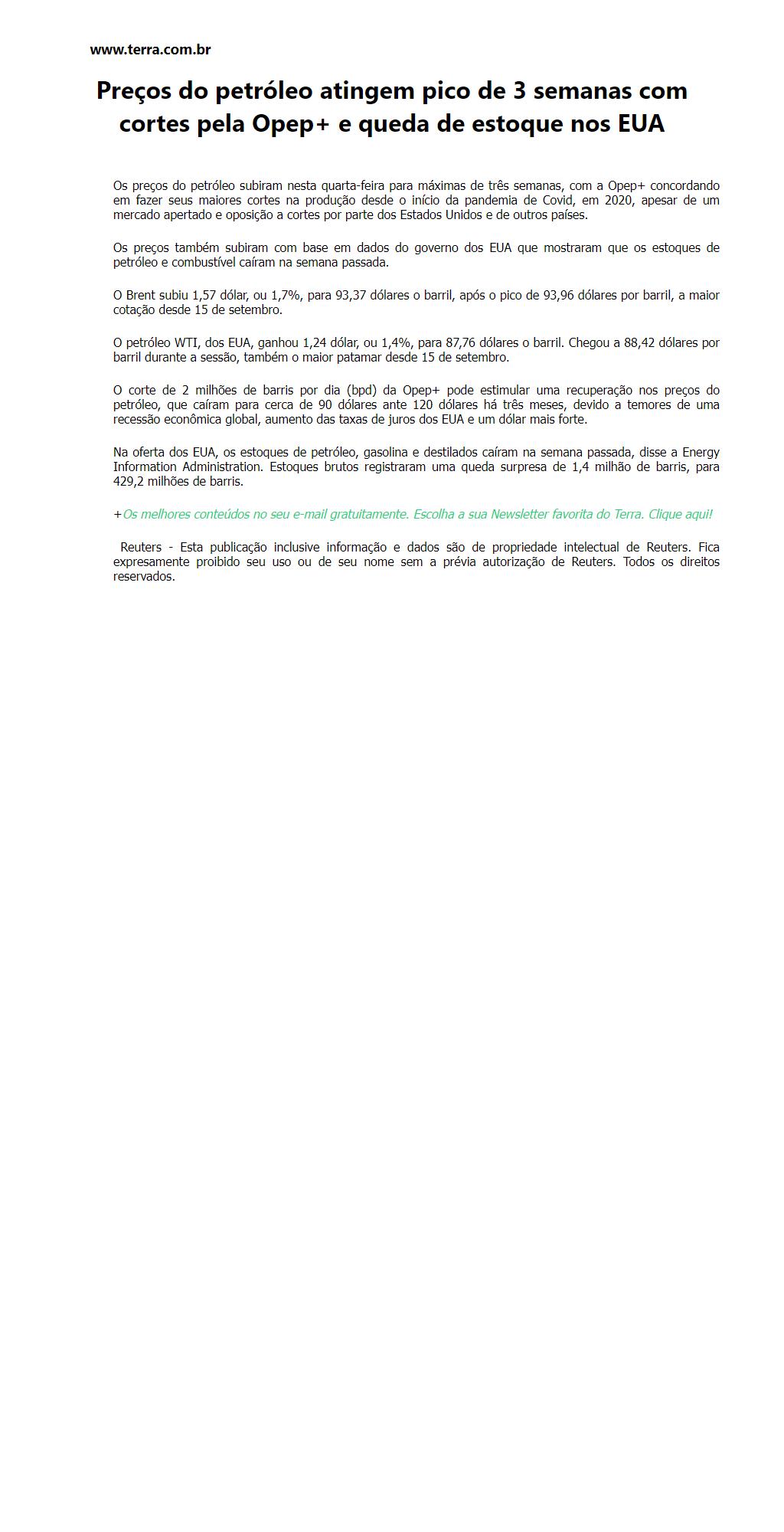Preços do petróleo atingem pico de 3 semanas com cortes pela Opep+ e queda de estoque nos EUA