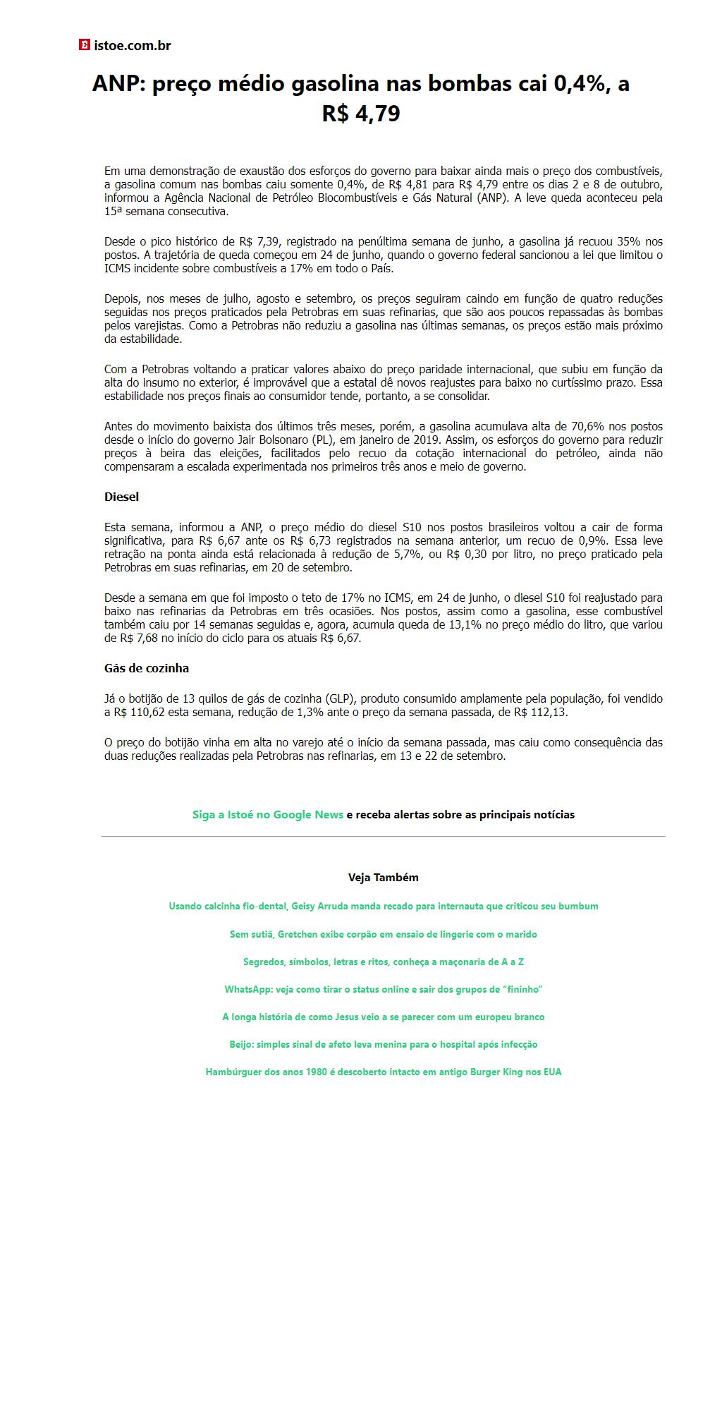 ANP: preço médio gasolina nas bombas cai 0,4%, a R$ 4,79