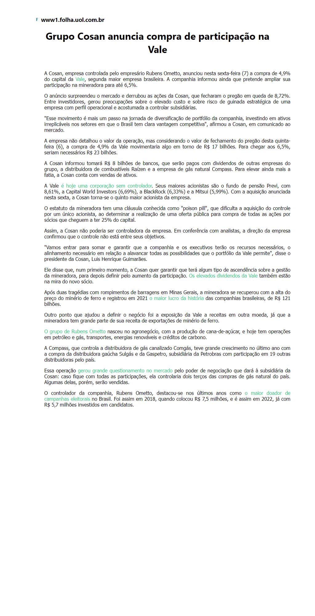 Grupo Cosan anuncia compra de participação na Vale