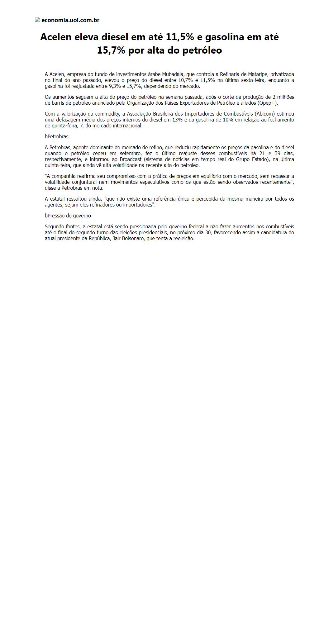 Acelen eleva diesel em até 11,5% e gasolina em até 15,7% por alta do petróleo
