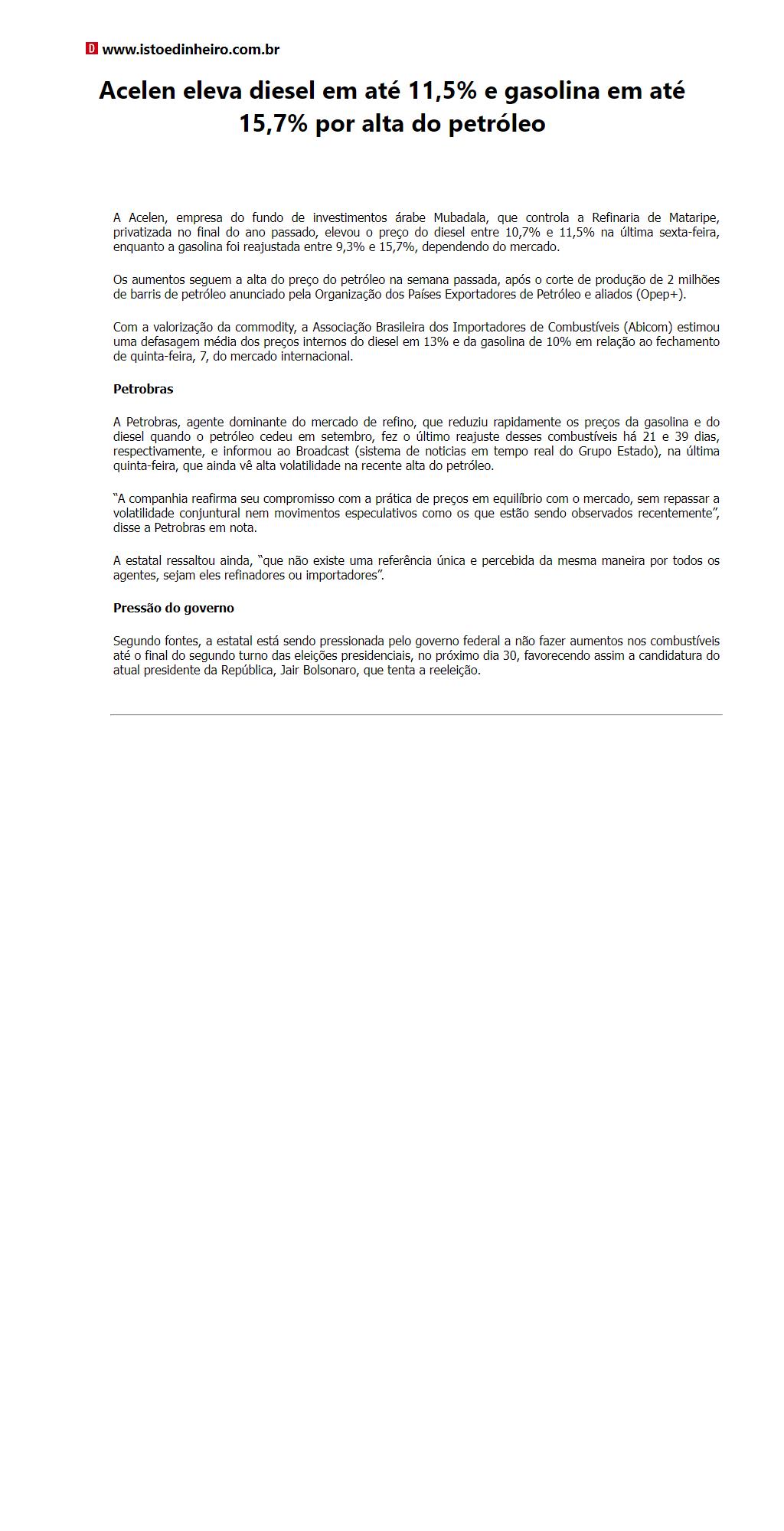 Acelen eleva diesel em até 11,5% e gasolina em até 15,7% por alta do petróleo
