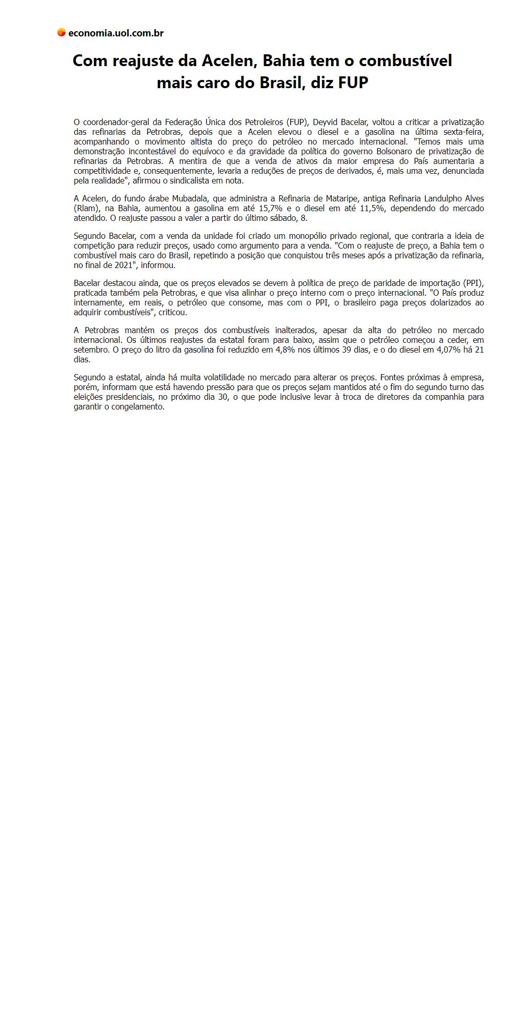 Com reajuste da Acelen, Bahia tem o combustível mais caro do Brasil, diz FUP