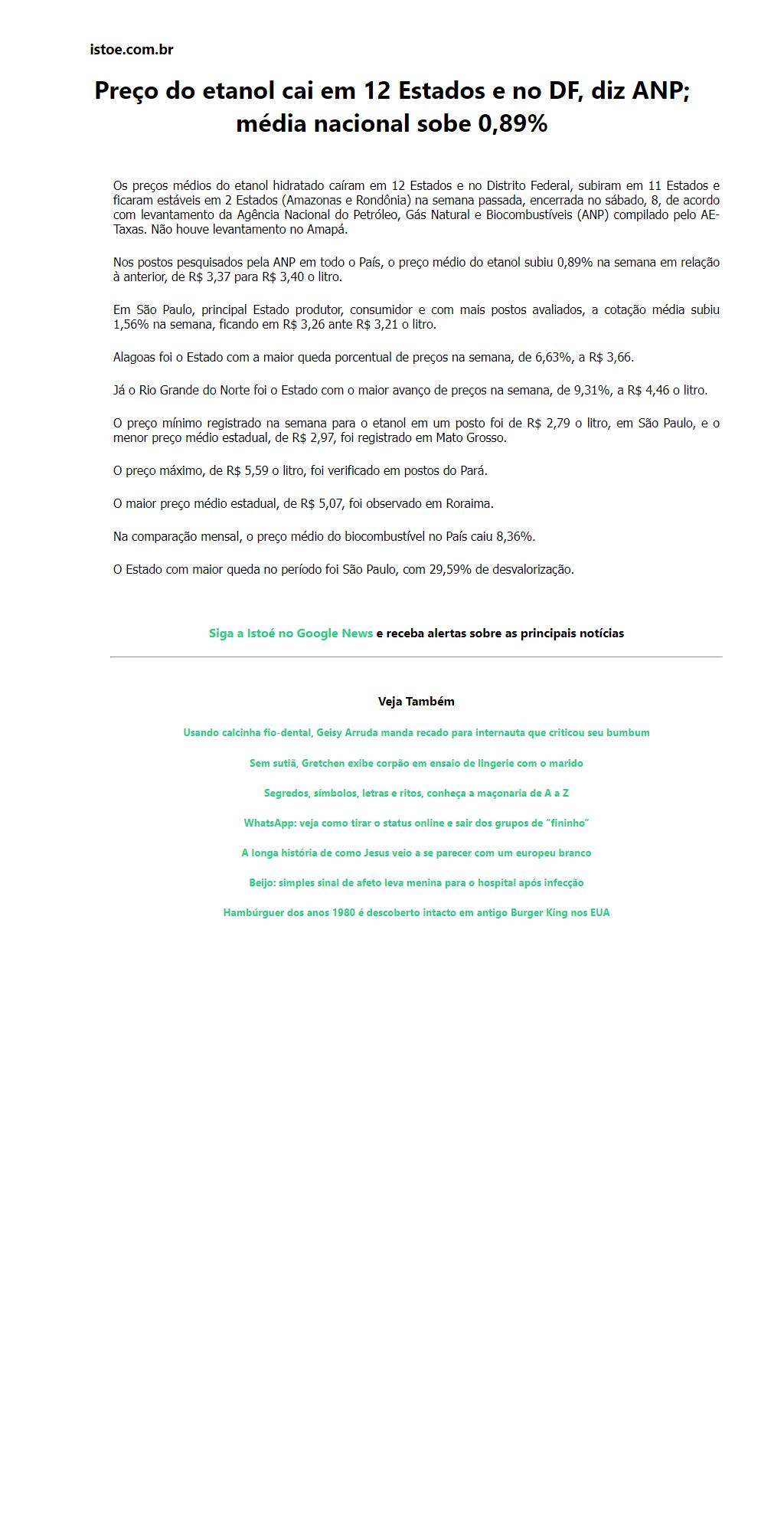 Preço do etanol cai em 12 Estados e no DF, diz ANP; média nacional sobe 0,89%