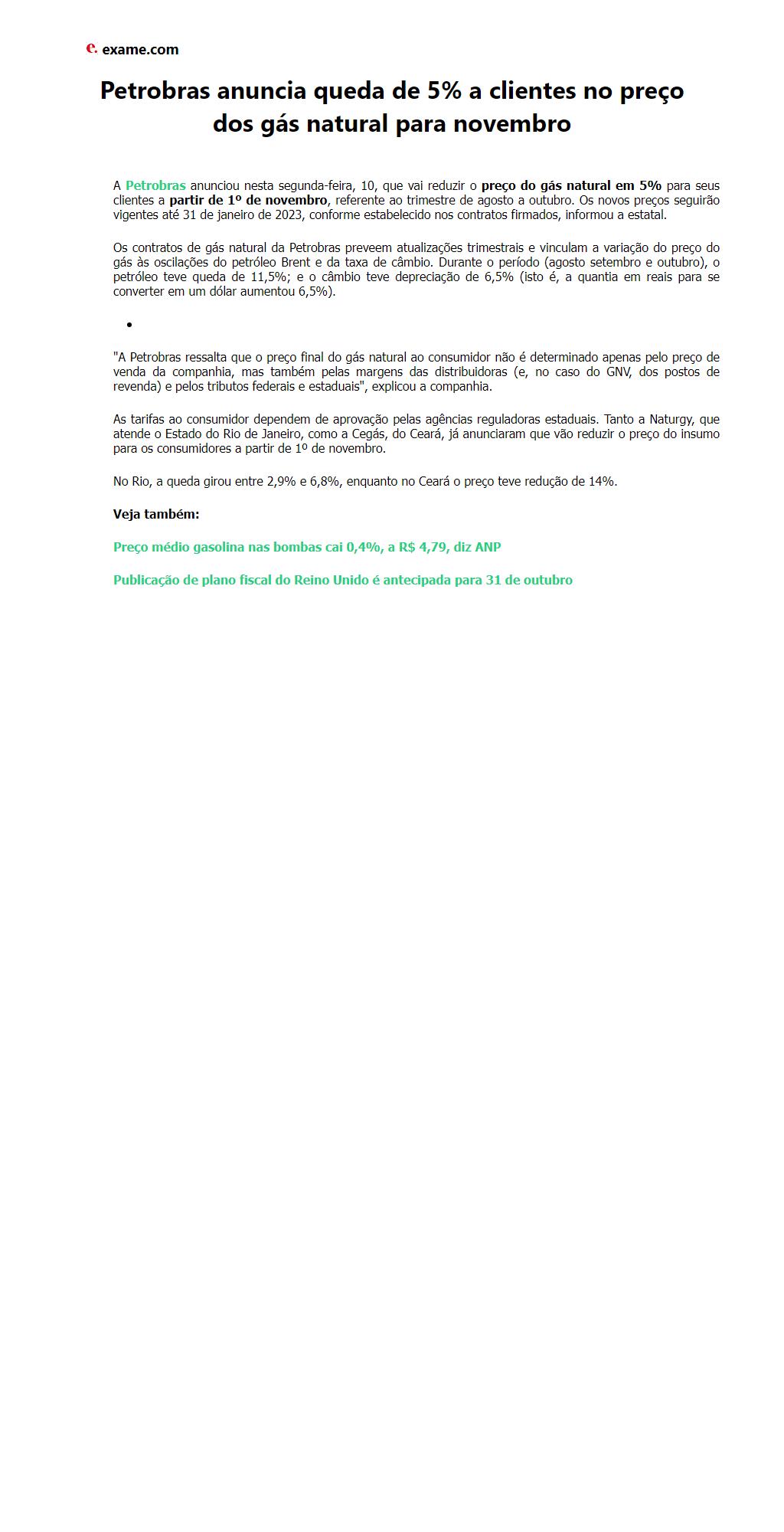 Petrobras anuncia queda de 5% a clientes no preço dos gás natural para novembro