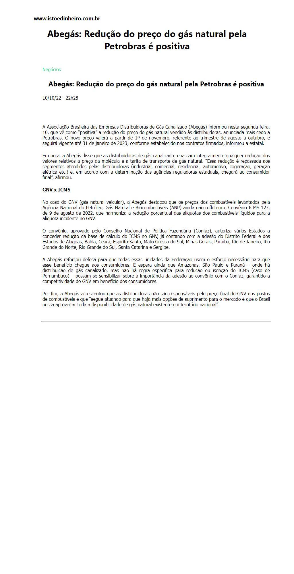Abegás: Redução do preço do gás natural pela Petrobras é positiva