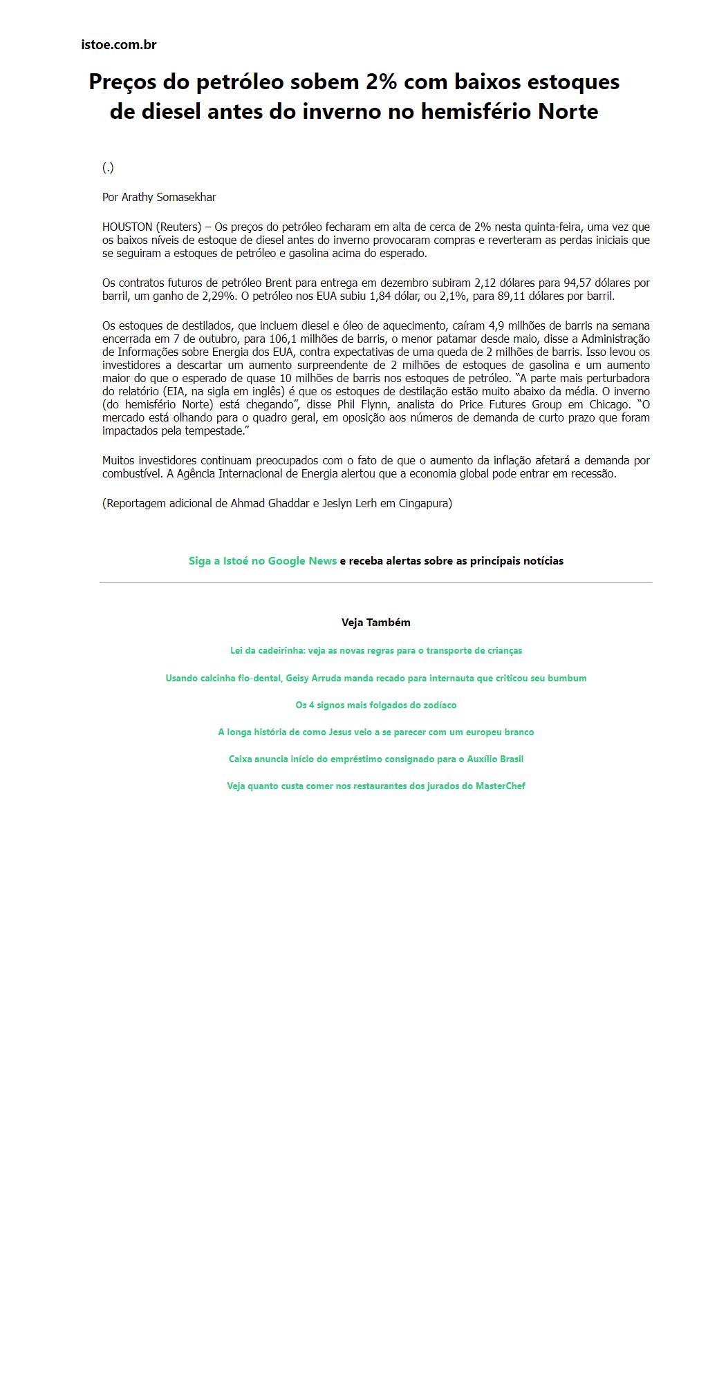 Preços do petróleo sobem 2% com baixos estoques de diesel antes do inverno no hemisfério Norte