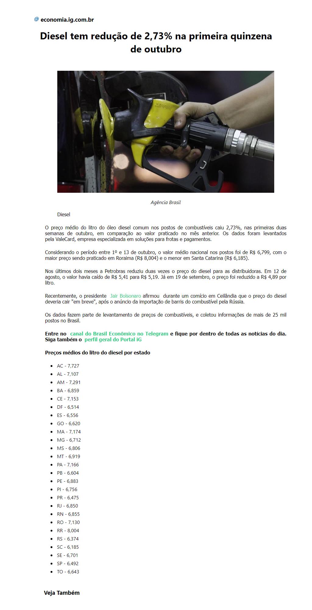Diesel tem redução de 2,73% na primeira quinzena de outubro